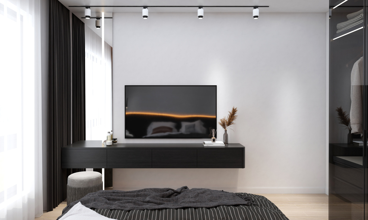 懸空電視柜既不顯單調(diào)又很實(shí)用,方便收納小物件,臥室鋪設(shè)木紋地板,采用無主燈設(shè)計,摒除壓抑感,營造出溫暖的氛圍。