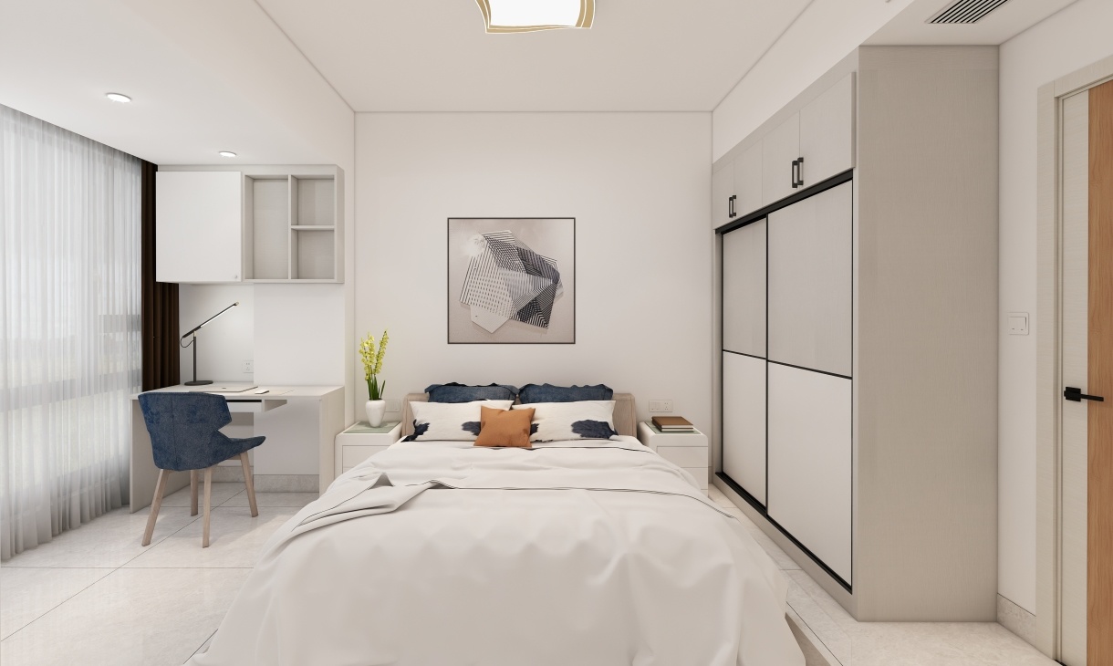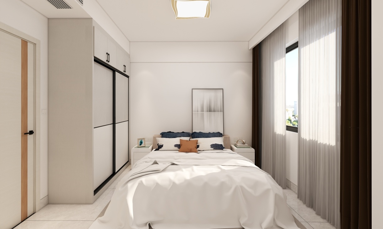 次臥的到頂衣柜設計成推拉門,增強了收納與實用能力,窗簾色彩與主臥一致,增強每個空間的聯系性。