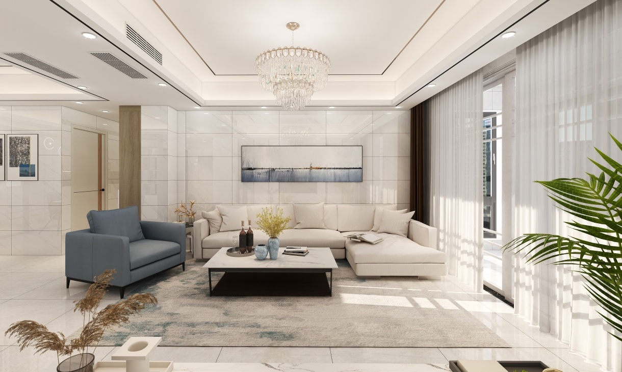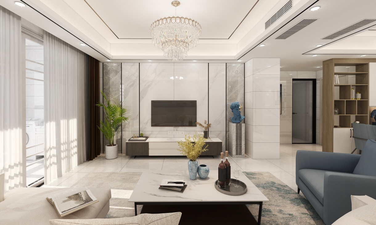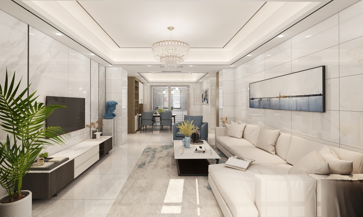 客廳設計淺灰色墻體+白色大理石地板的搭配裝飾,突出了家的大氣與簡潔,選用水晶主燈+輔助小射燈的方式,營造出了豐富的空間美感。