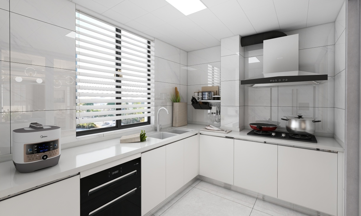 廚房的墻磚、地磚以及臺面都采用了深淺不一白色系,視覺上擴大空間感,空間布局簡潔合理,烹飪方便又實用。