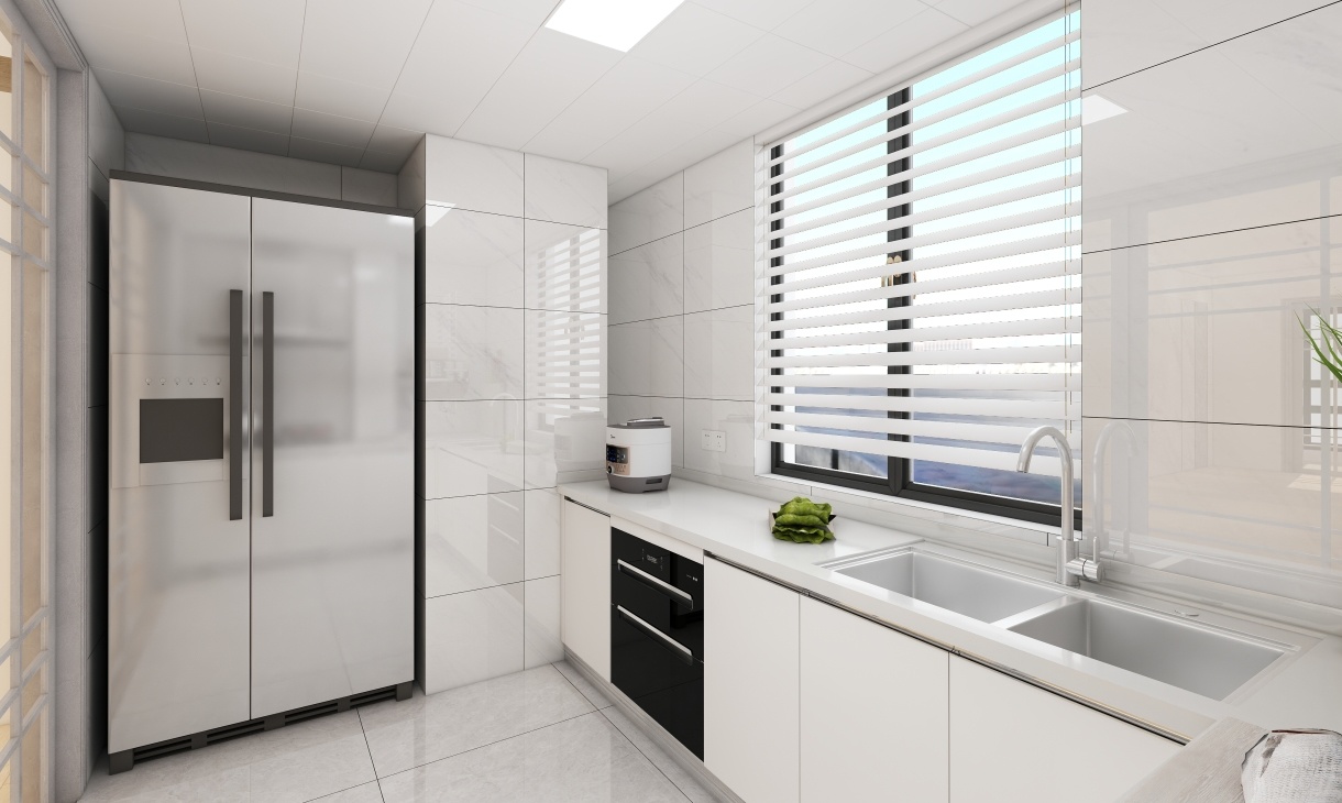 轉角處放置冰箱,合理布局格外美觀,廚房設計了置物空間,整體設計以白色系干凈明亮為主讓收納變得更加整潔。