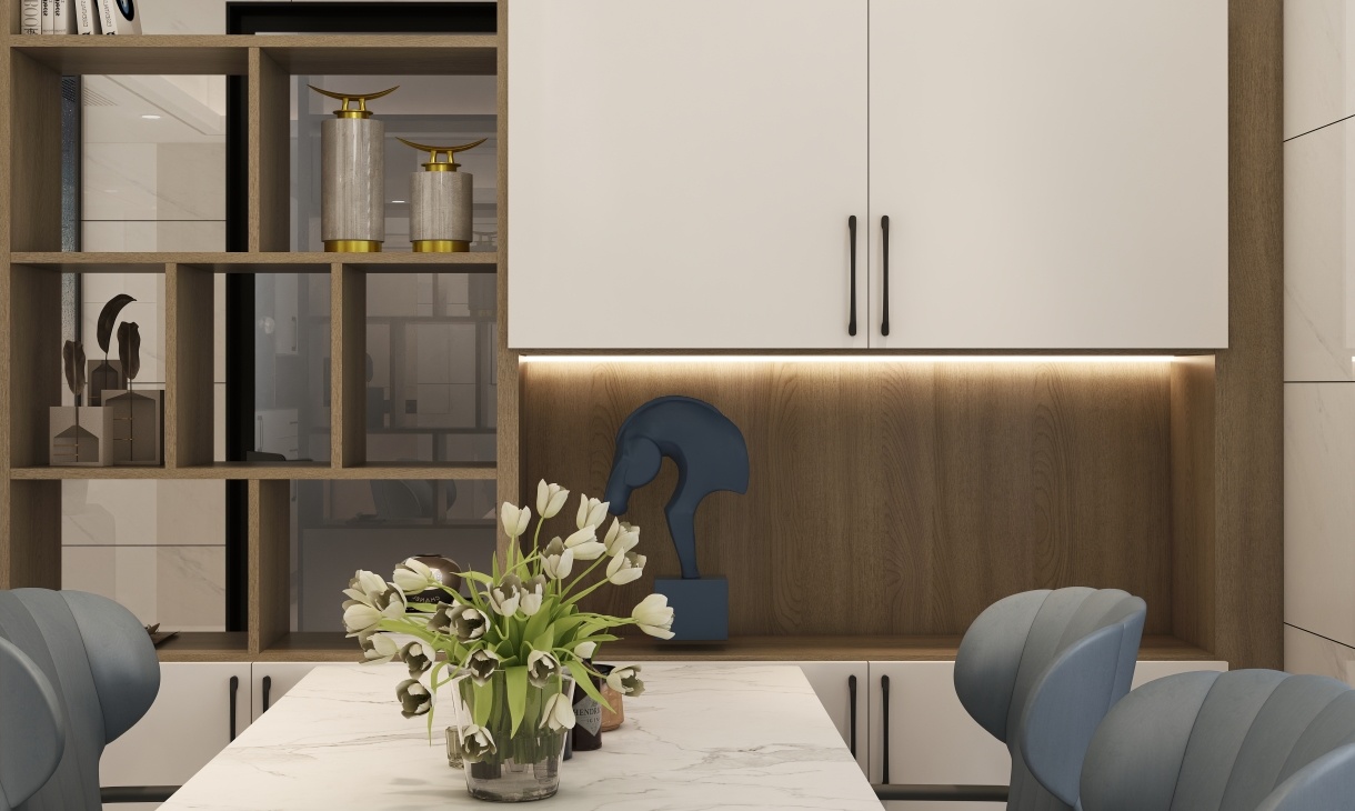 餐廳空間的顏色設計與客廳相呼應,線條感十足的餐桌椅簡潔又不失品位,白色+原木色的餐邊柜簡約高級。