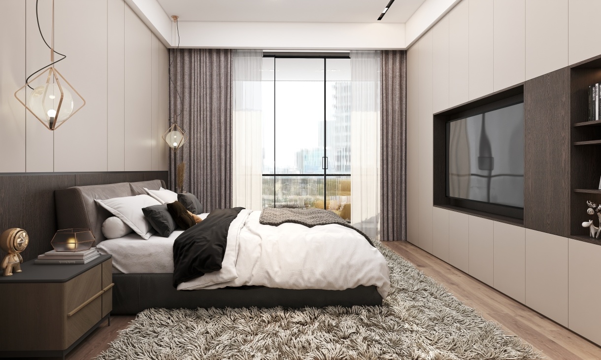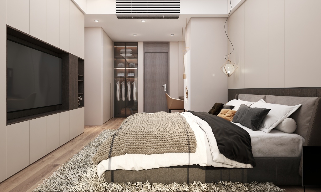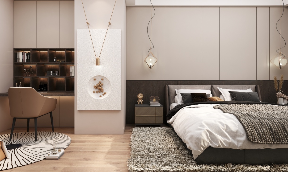 臥室采用素色系的色彩搭配,墻面上沒有過多的點(diǎn)綴,顯得更加溫馨感十足,床頭吊燈裝飾彰顯品位。