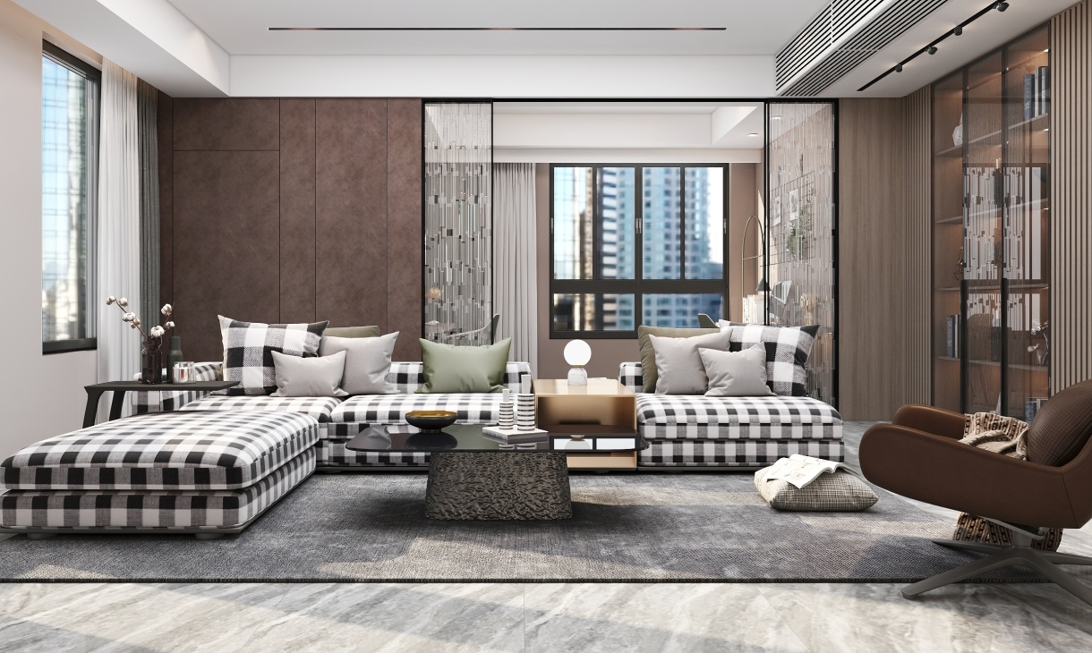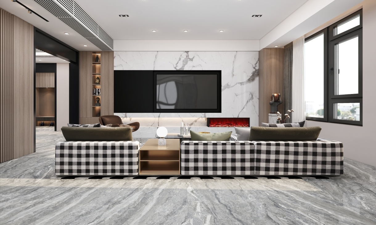 現(xiàn)代客廳的設(shè)計(jì)以“簡”為主,黑白格子的沙發(fā)現(xiàn)代感十足,灰色石材的電視背景墻提升品位,整個(gè)空間的布局線條簡練。