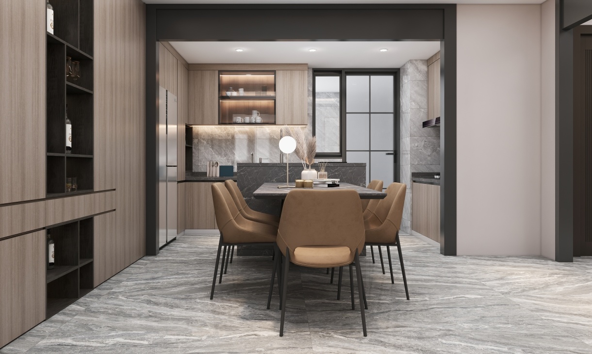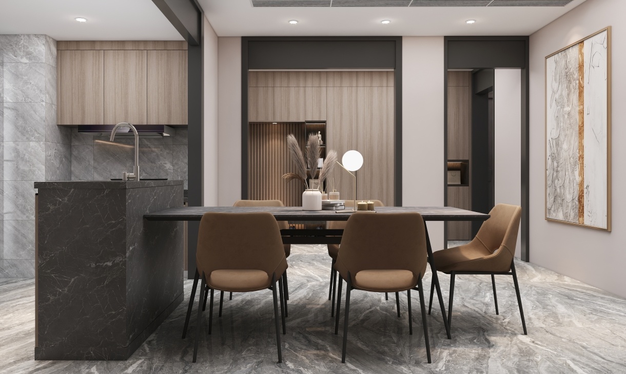 餐桌+西廚臺(tái)面,空間以簡潔干凈為主,皮質(zhì)、木材等兩種元素搭配組合,質(zhì)感十足也方便日常打理。