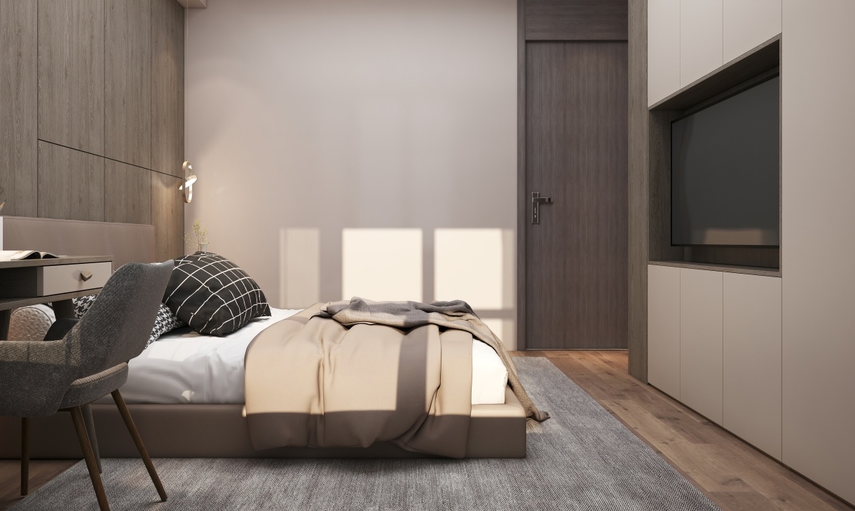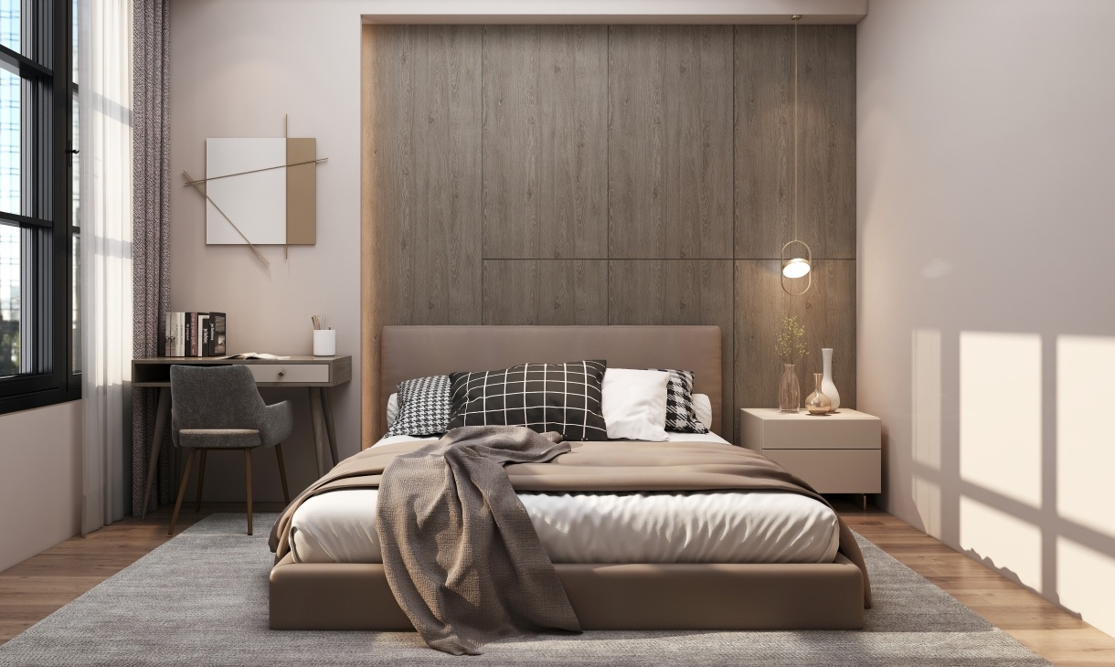 次臥的設(shè)計(jì)與主臥相呼應(yīng),床頭背景墻與墻面做了一個(gè)區(qū)分,增加層次感,使得整個(gè)家都充滿溫馨舒適之感。