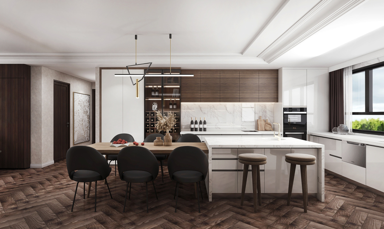 餐桌銜接石英石吧臺,木材與石材的完美碰撞形成獨(dú)特美感,餐桌上擺放著花束裝飾空間,提升品位。