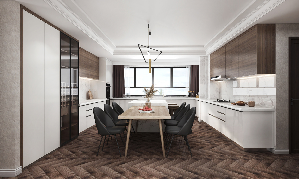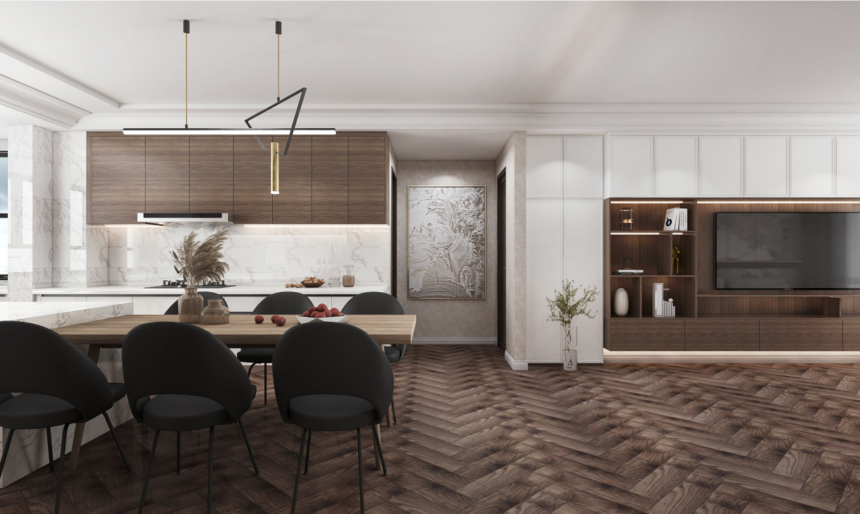 客餐廳設(shè)計(jì)一體化,地面鋪設(shè)木地板,獨(dú)特的紋理豐富空間,開放式的廚房設(shè)計(jì)大氣時(shí)尚,整個(gè)空間盡顯品質(zhì)生活。