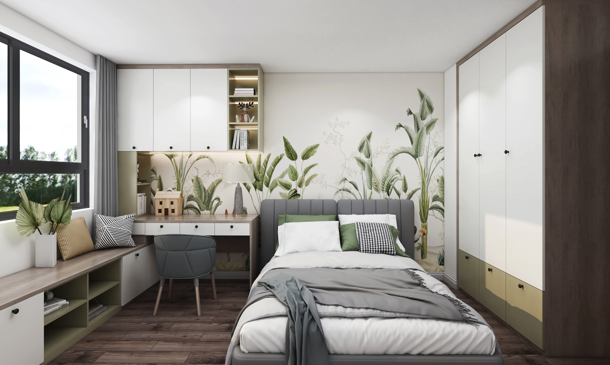 次臥飄窗與書桌組合設(shè)計(jì)于一體,去掉裝飾性的床頭柜巧妙利用空間設(shè)計(jì)實(shí)用書桌組合,簡約實(shí)用到頂衣柜,白色和綠色的拼接設(shè)計(jì)讓人感覺溫馨又舒適。
