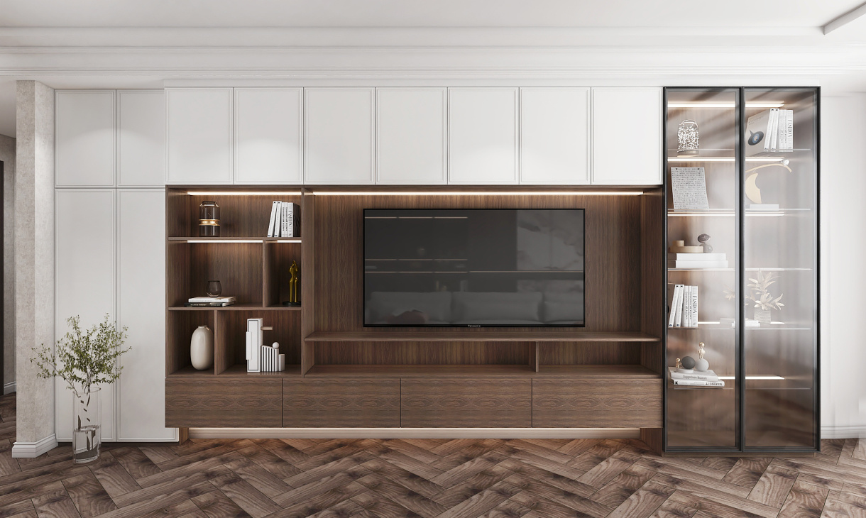 客廳的到頂式電視柜設(shè)計(jì),白色+原木色造型簡潔大氣,一柜到頂?shù)氖占{柜,玻璃柜門時(shí)尚有質(zhì)感。