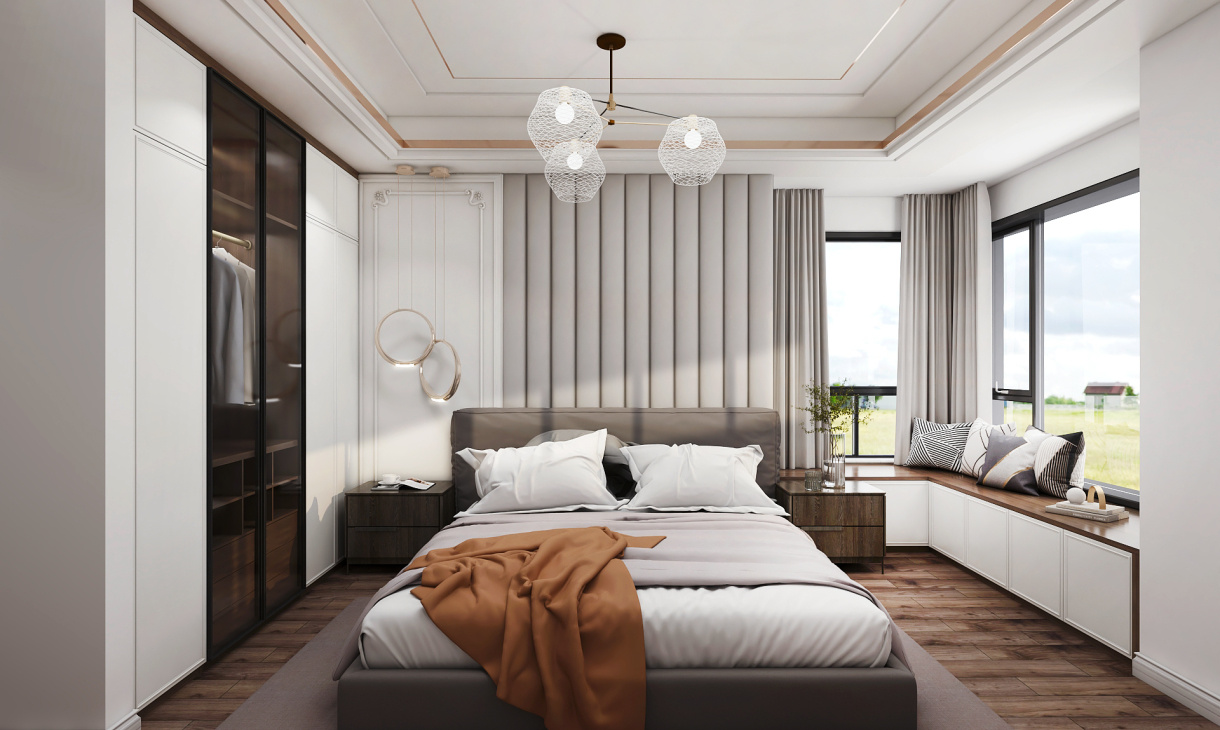 臥室的床頭背景墻作軟包設(shè)計(jì),大面積的飄窗使得臥室格外通透,設(shè)計(jì)精巧吊燈搭配床頭柜上的懸掛裝飾燈,讓臥室格外溫馨。