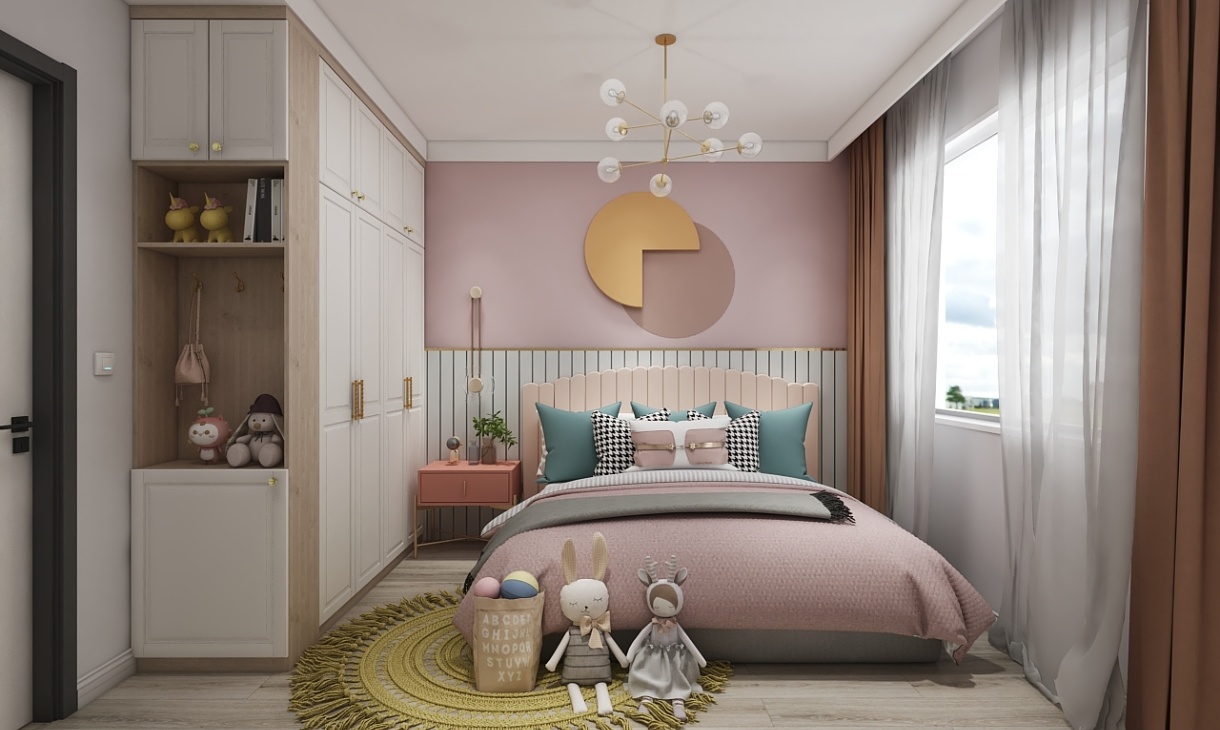 次臥的顏色以馬卡龍粉色為主,到頂衣柜滿足收納需求,床頭背景墻做了拼接色的硬包設計時尚又美觀,顏色豐富發床飾搭配橙色的窗簾,營造出一種溫馨不失品味的臥室空間。