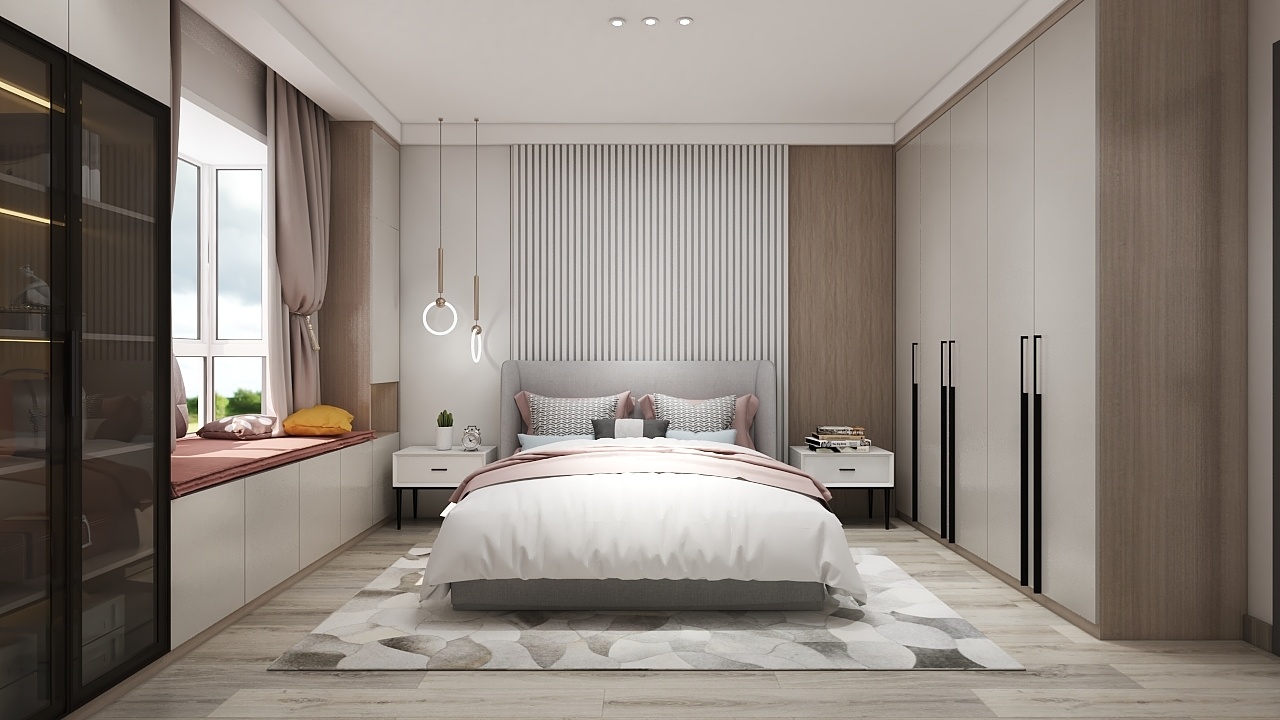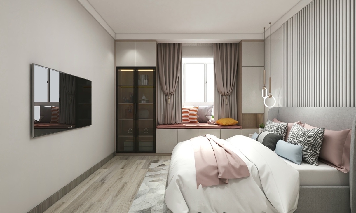 主臥的設設計以簡潔大氣為主,一柜到頂既滿足收納需求又很美觀,地面鋪設木地板舒適加倍,飄窗空間不浪費,底部設計收納柜。
