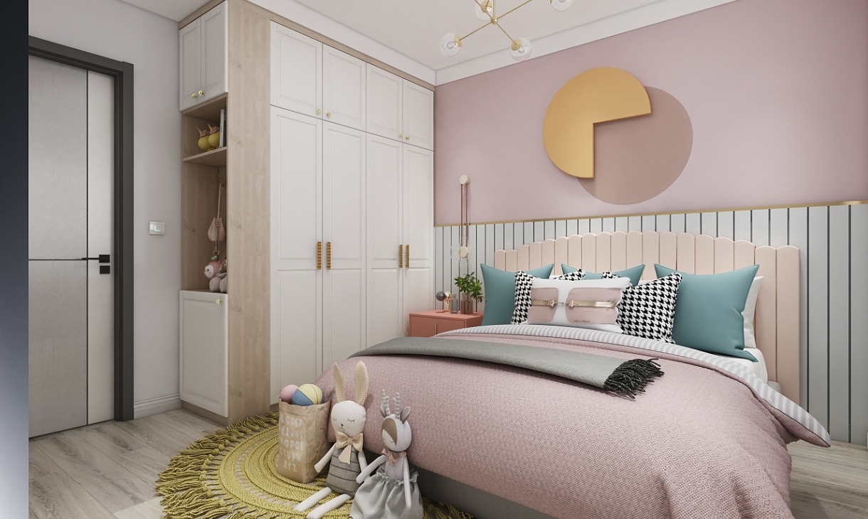 衣柜轉角空間不浪費,設計成開放式展示空間,上方的吊燈帶有金屬元素,搭配顏色豐富的床飾臥室溫馨又有檔次,很適合做兒童房。