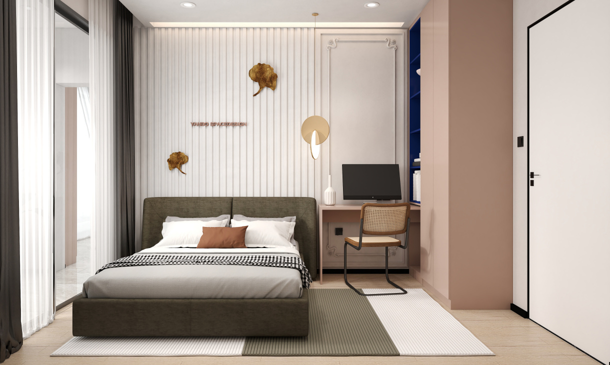 次臥衣柜與書桌組合的設計更注重實用性與簡潔性,床頭背景墻依舊采用石膏線與其他造型相拼接,灰色的床飾增添沉穩之感。
