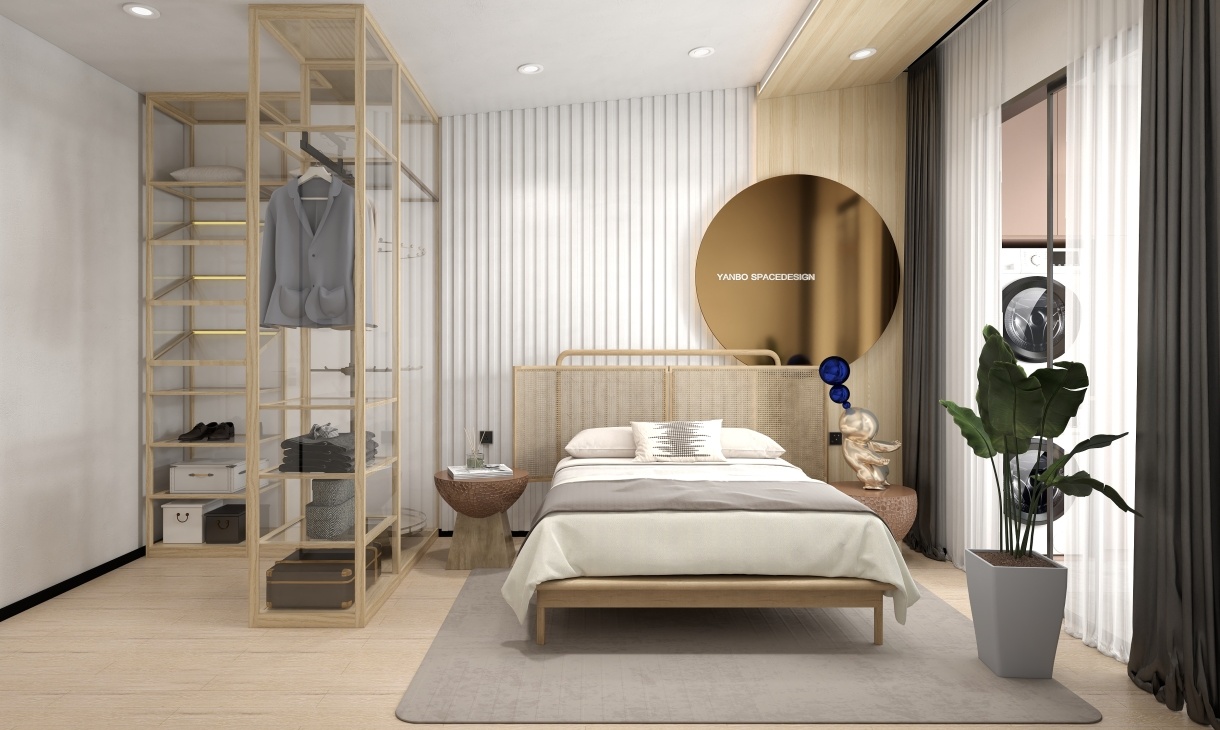 家里有長輩或者老人,設計臥室要以沉穩為主,衣柜以衣架組合形式來展現,整體空間的顏色素凈大氣,淺色木地板增添舒適性。