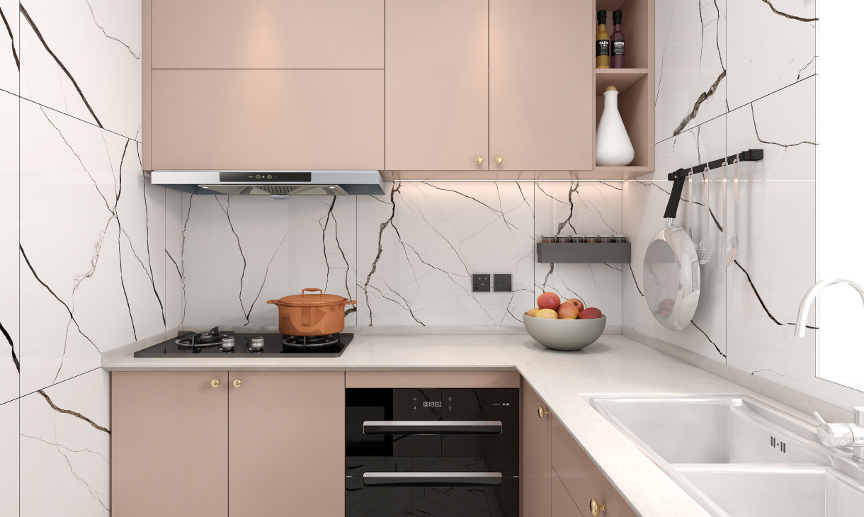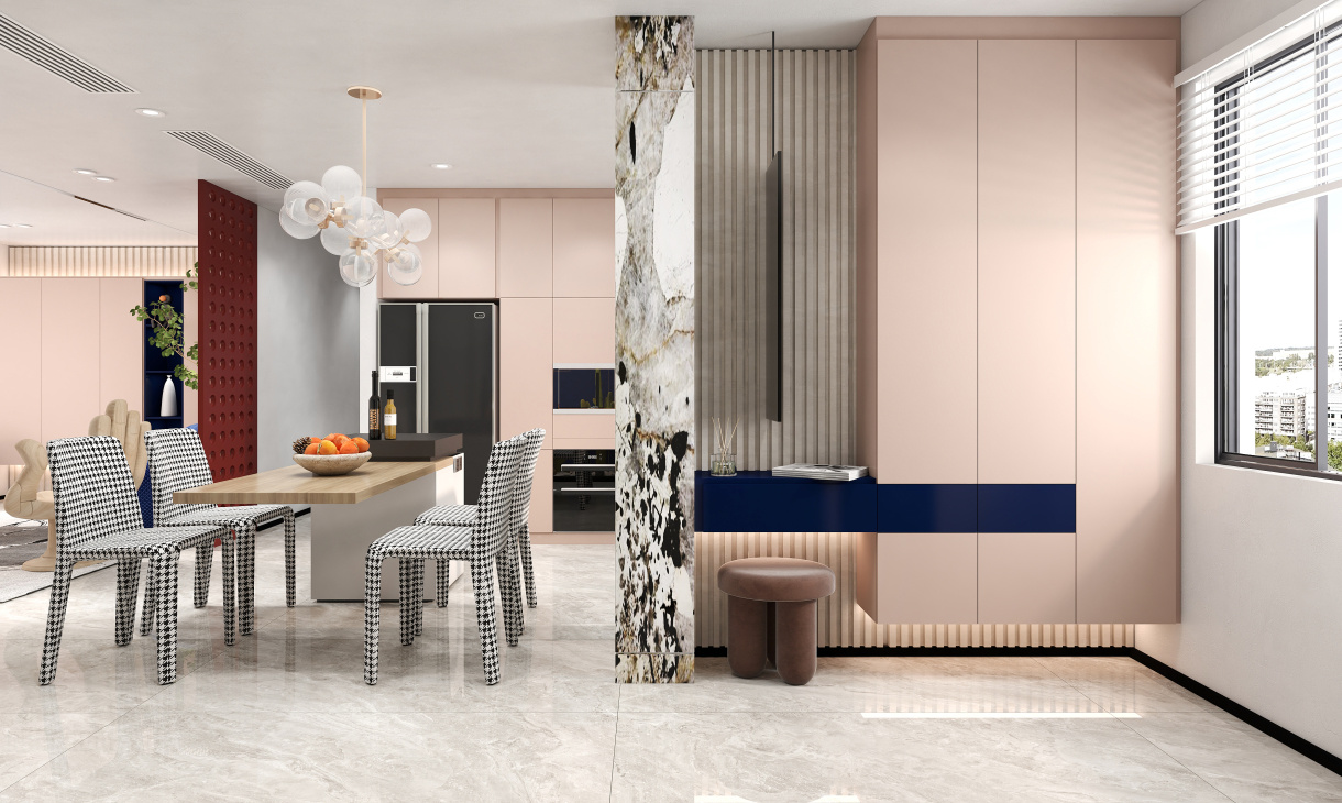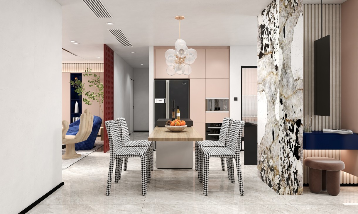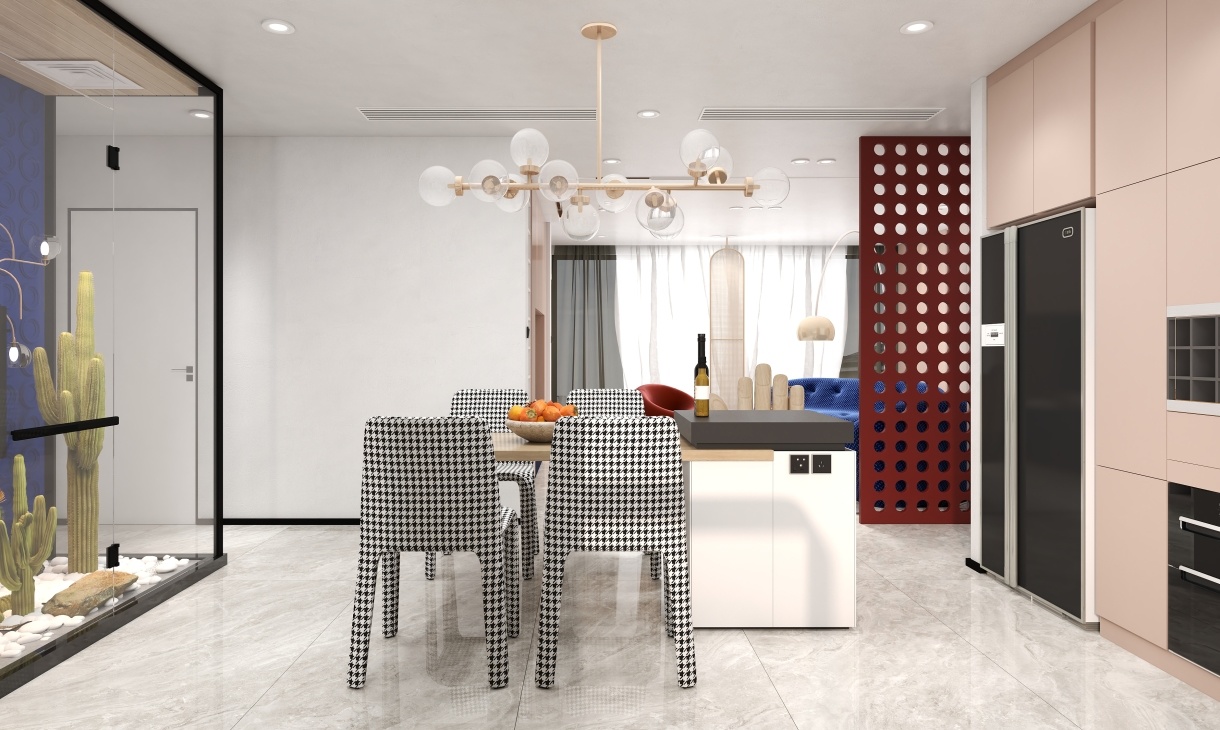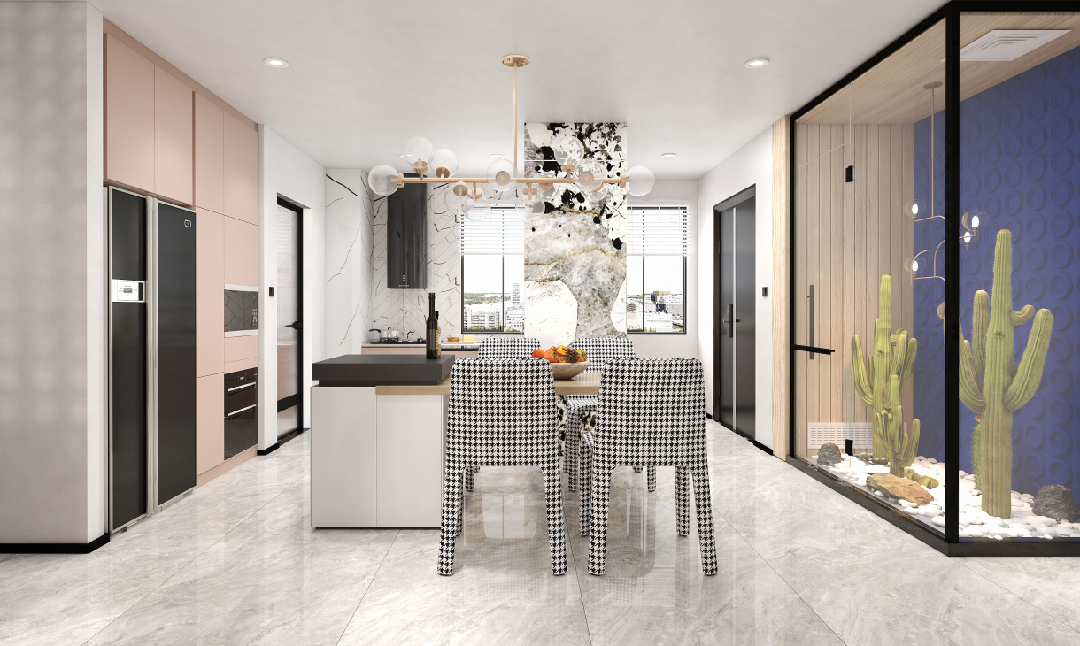 餐廳的地面鋪設灰白色的地磚,靠近窗設計開放式廚房臺面,既能增加空間的收納能力又格外美觀,抽象彩色大理石隔斷墻面品位升級。