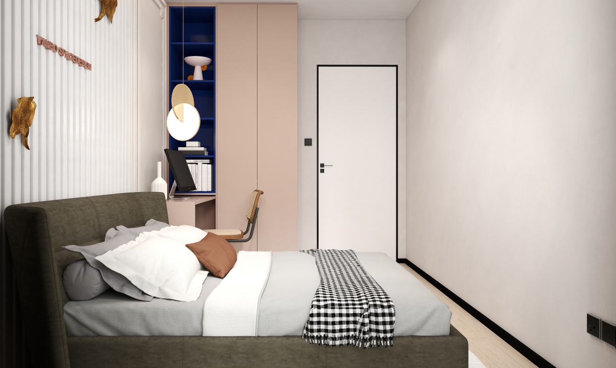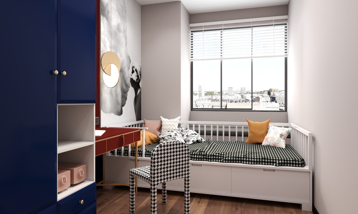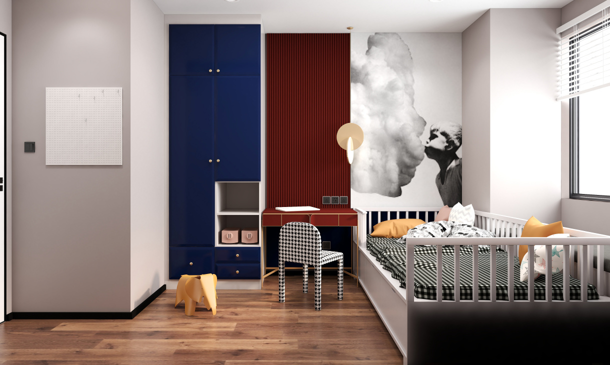 兒童房的顏色豐富,木地板與黑白格子成為空間主色,深藍色衣柜與朱紅色書桌組合使得空間更有質感。