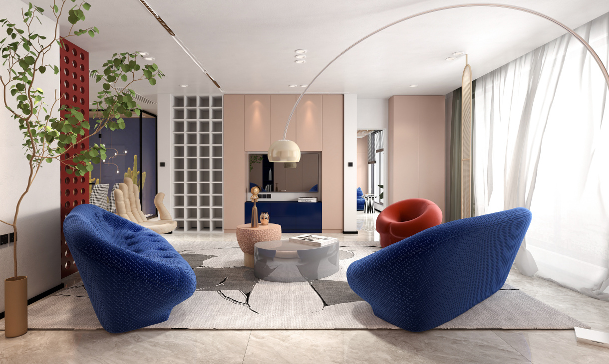 客廳的電視柜整墻設計,香檳色時尚大氣,藍色的沙發點綴空間,吊燈的設計感十足,讓整個客廳彰顯獨特。