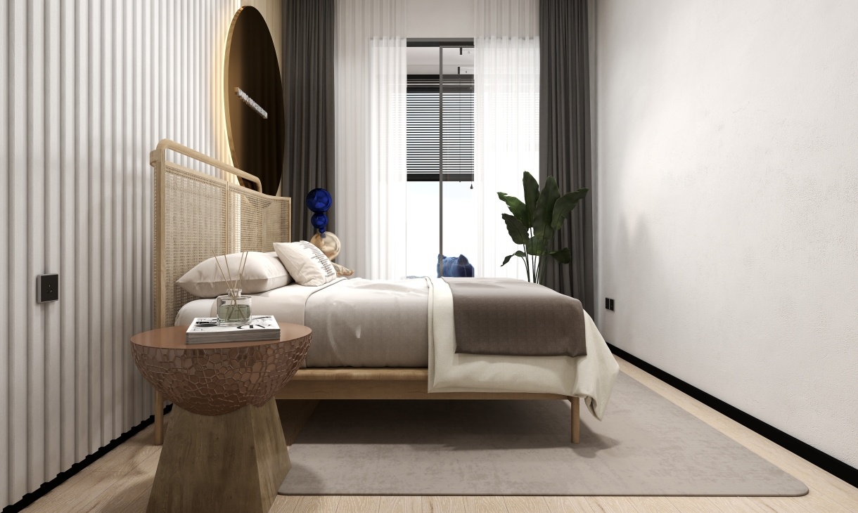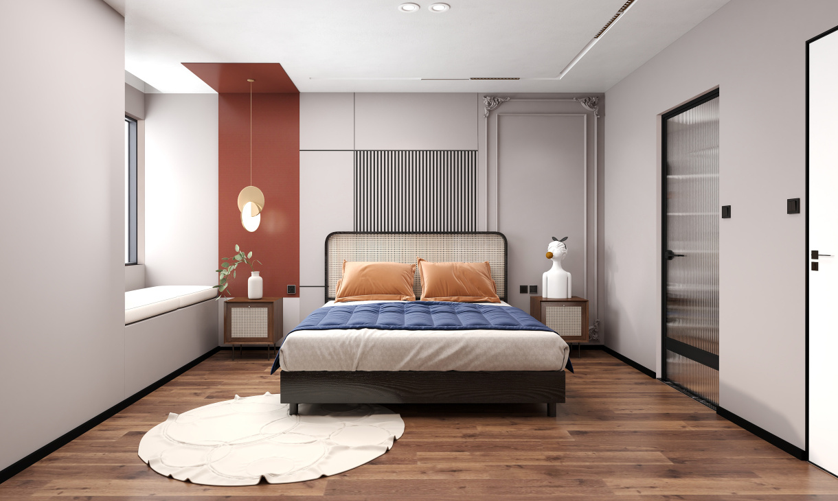 主臥的床頭背景墻做硬包,石膏線搭配亮色拼接,簡潔又大氣,不同元素的搭配盡顯獨特生活品位。