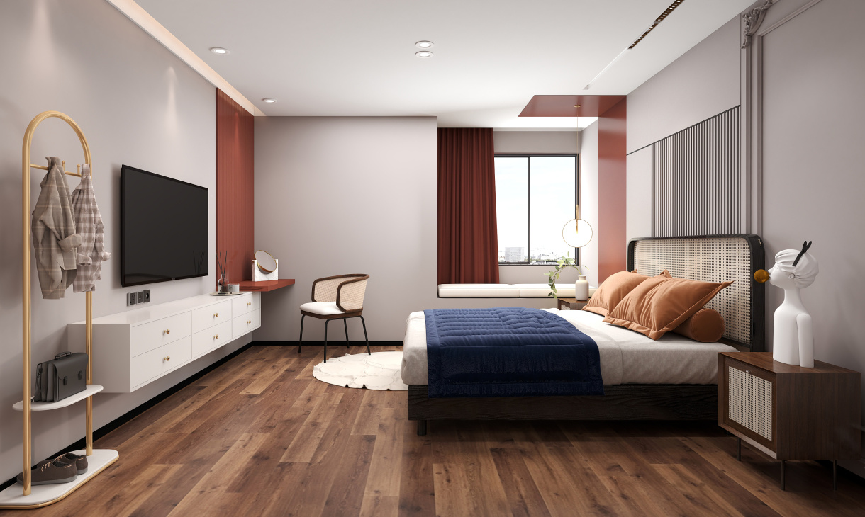 主臥鋪設木地板,飄窗設計成實用休閑區,電視墻與電視柜設計以簡為主,整體空間大氣時尚。