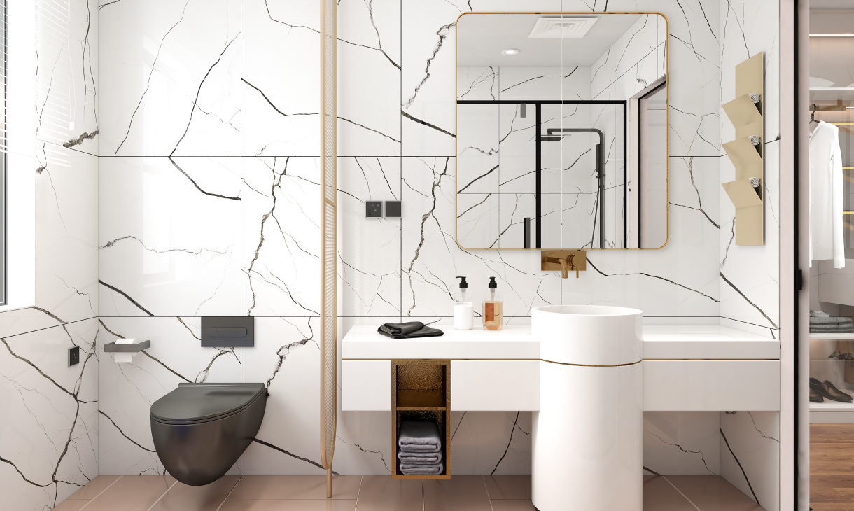 衛生間設計區域劃分明確,實現干濕分離,白色的洗漱臺時尚簡潔,金屬色的屏風做隔斷,墻面瓷磚與其他空間相呼應,統一又大氣。