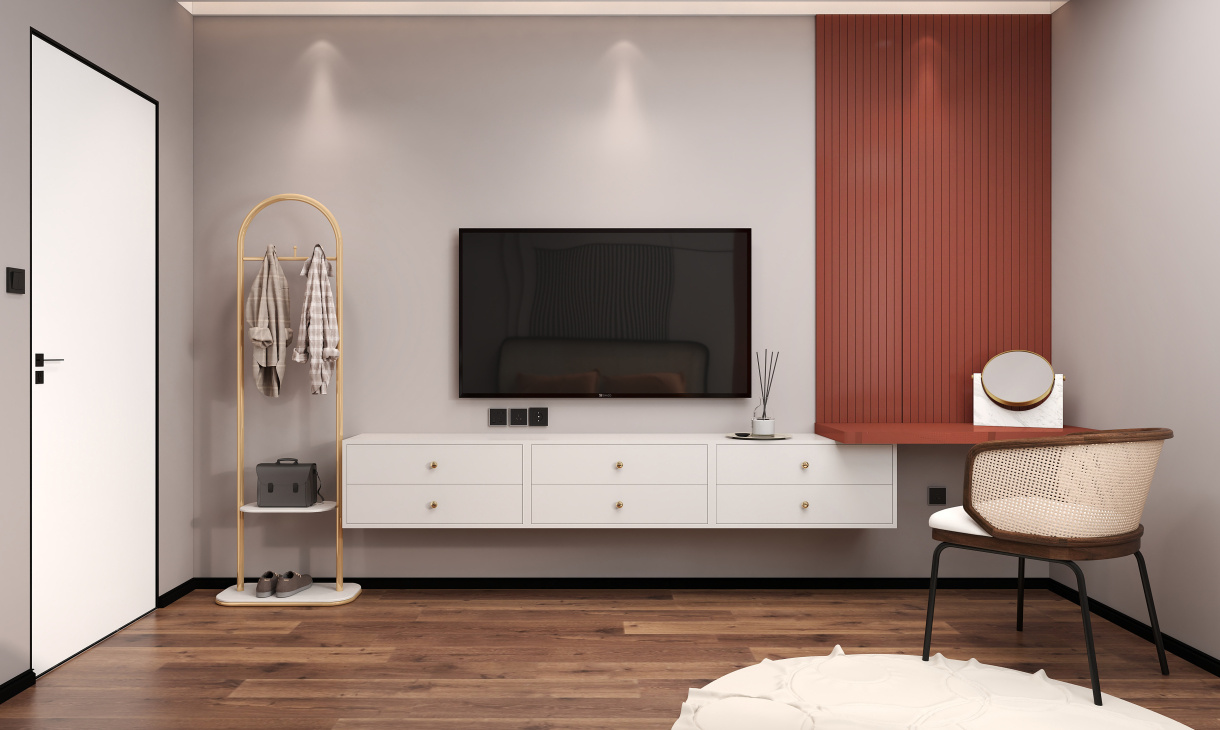電視柜與梳妝臺相互銜接,懸空電視柜滿足小物件的收納需求,亮色拼接梳妝臺既實用又能點綴空間。