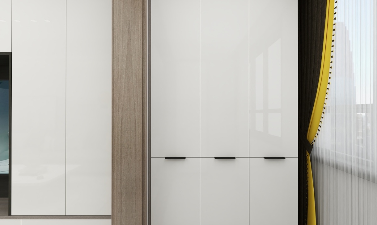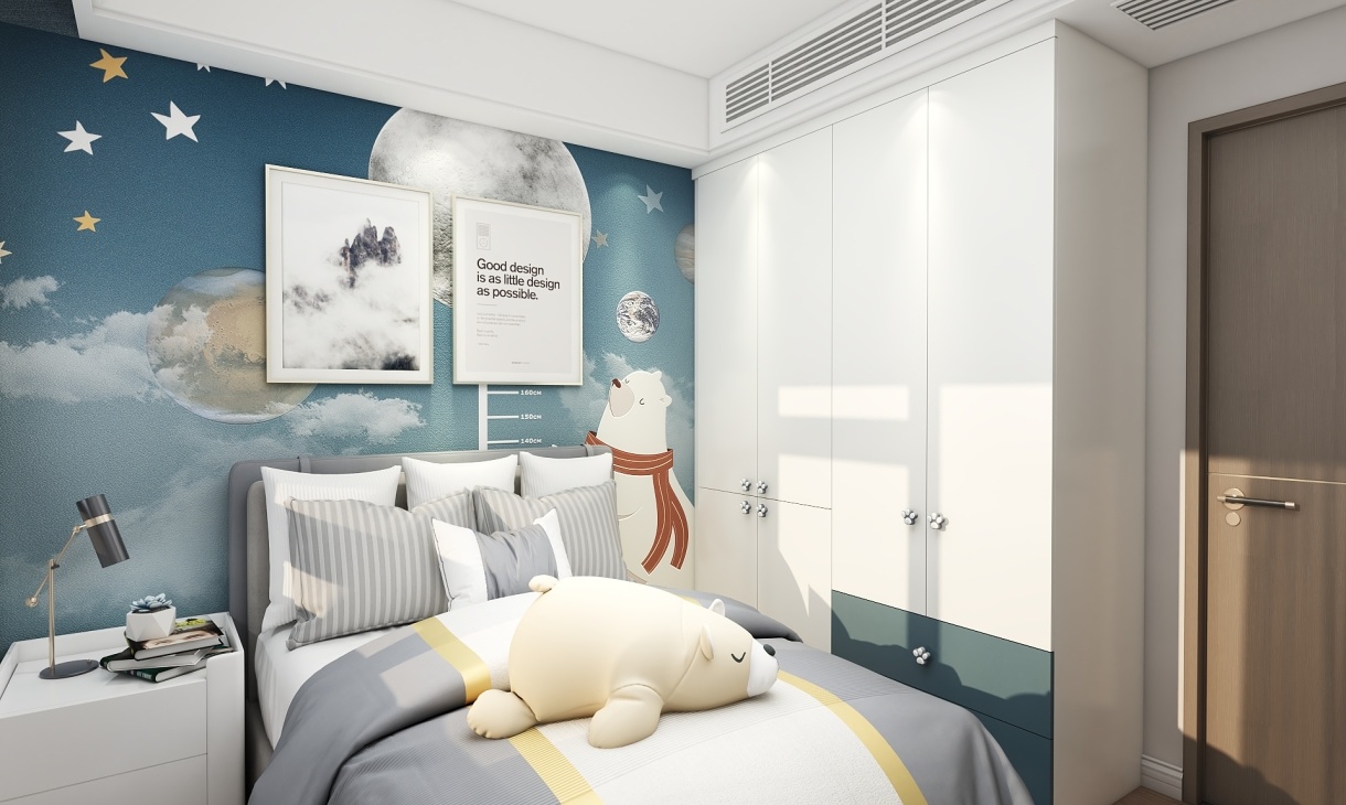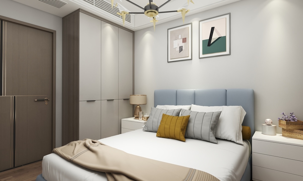 次臥米白色為主藍色作為點綴格外舒適,為了滿足空間收納需求,定制到頂收納衣柜,無縫設計避免后期時間長了落灰塵,不易清理。