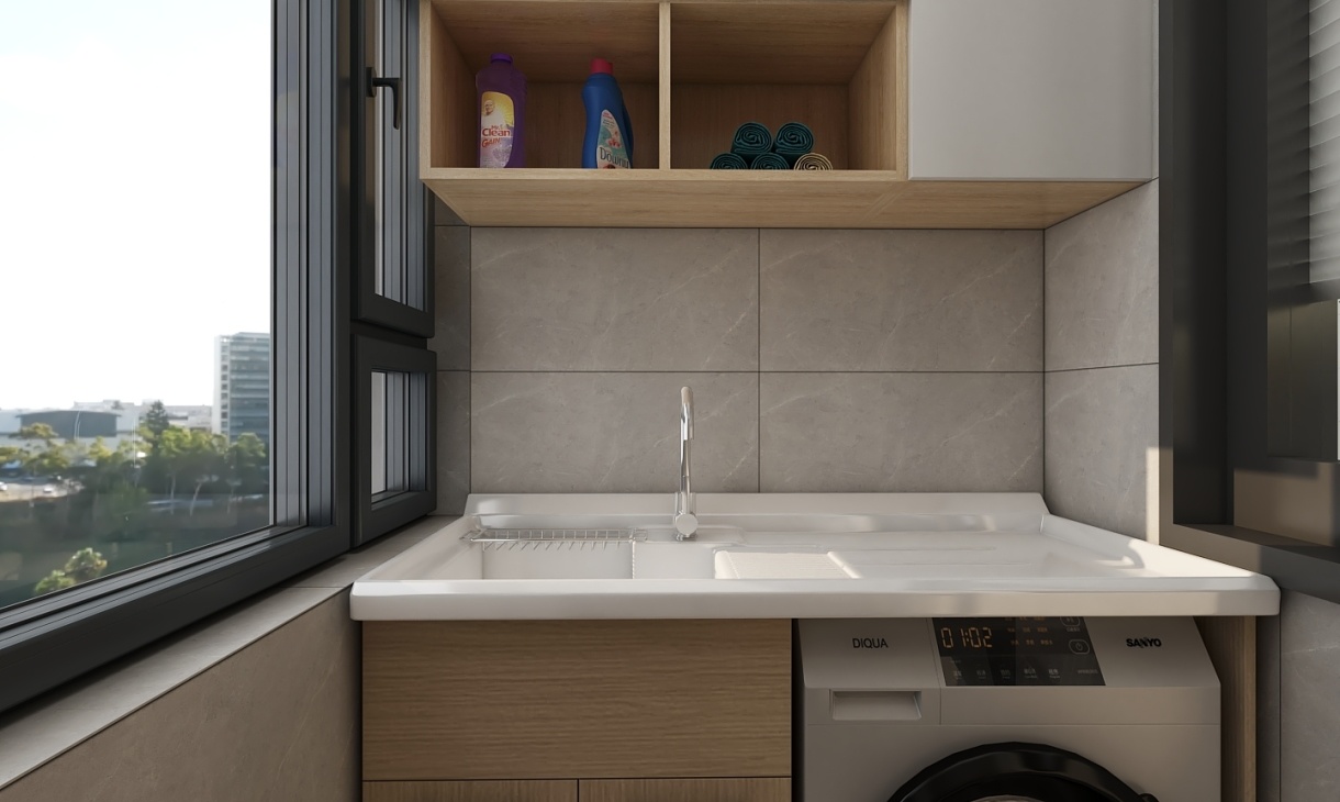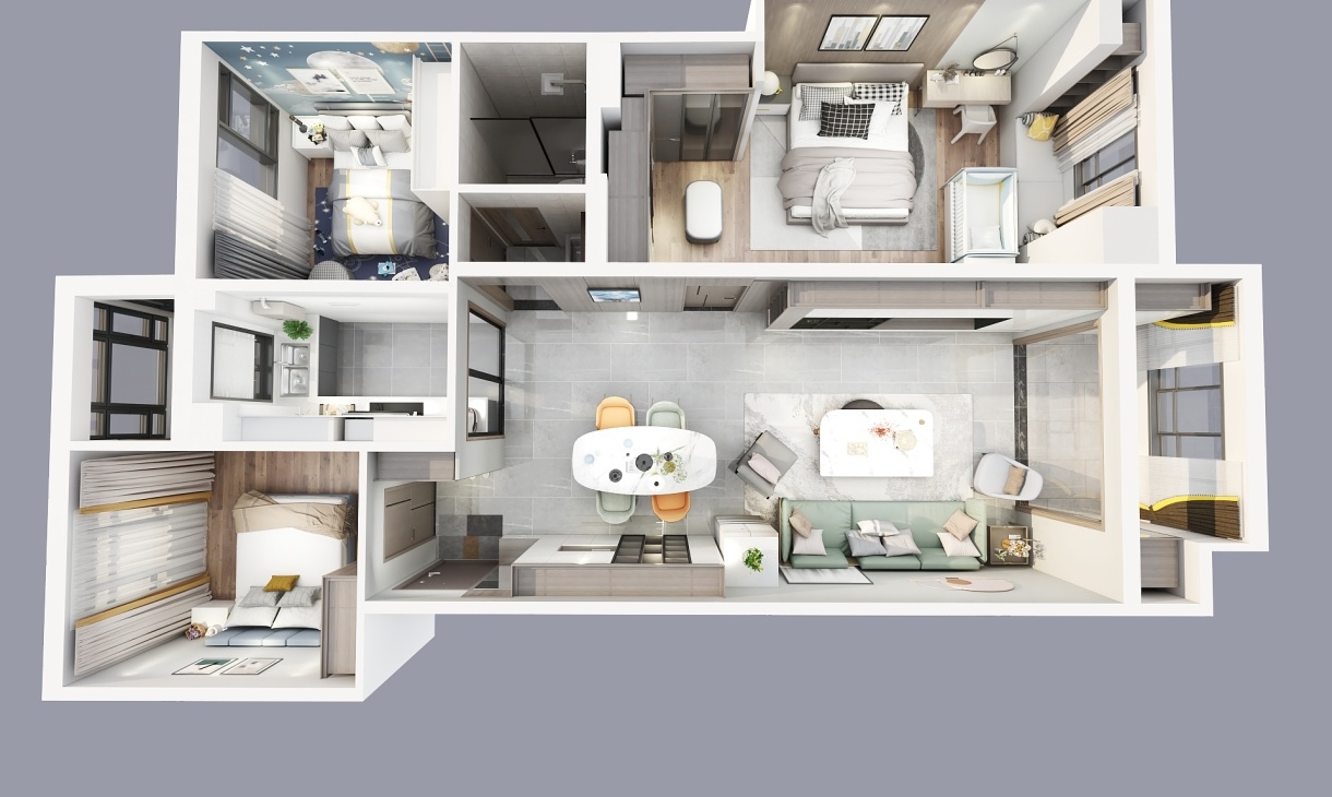從鳥瞰圖上可以看出,客廳外的陽臺直接打通,陽臺空間兩側設計成不同空間,實用與顏值兼顧。