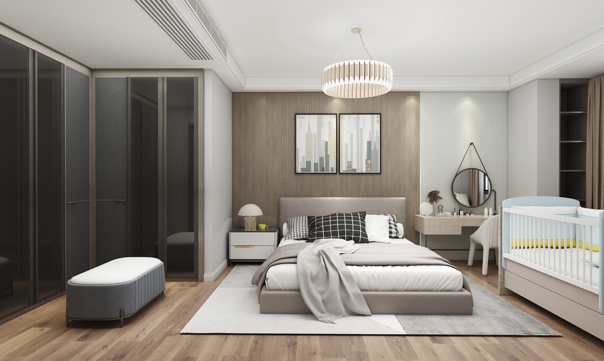 臥室空間地面鋪設溫馨時尚的木地板,床頭背景墻木材硬包,衣柜的樣式簡單卻不失品位,室內放置嬰兒車放置照顧嬰兒。