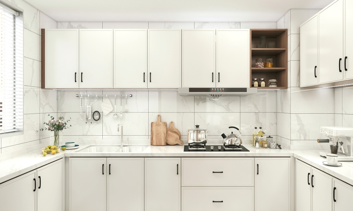 廚房的整體設(shè)計是以清新整潔為主,白色+原木色組合櫥柜搭配白色方磚簡潔大氣,上下櫥柜顏色一致,顯得格外干凈。