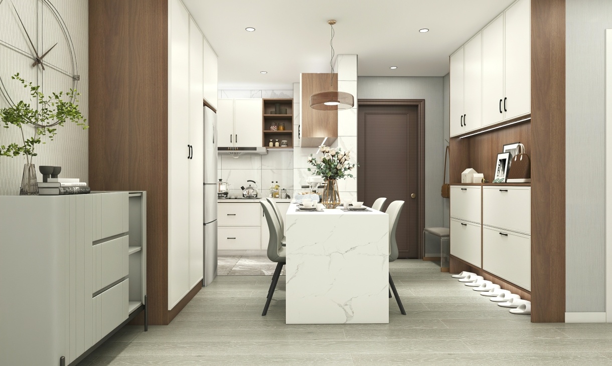 餐廳布局簡潔大氣,白色+原木色的餐邊柜實用加倍,臺面式的餐桌更有格調(diào),開放式的廚房實用加倍。