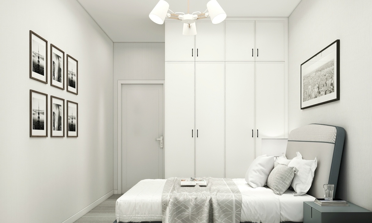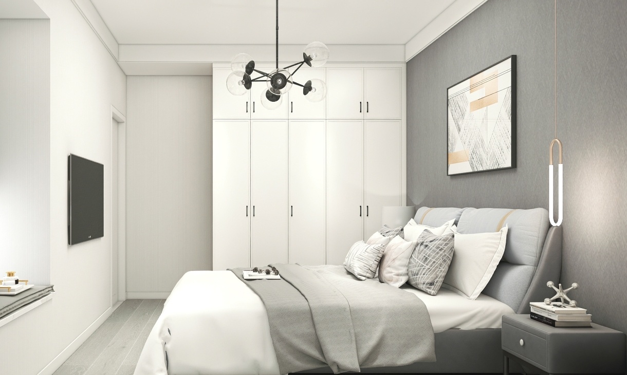 臥室的設(shè)計也很簡潔,以白色為主,灰色作為點綴,顯得非常干凈,到頂衣柜設(shè)計簡潔,卻能滿足臥室的收納需求。