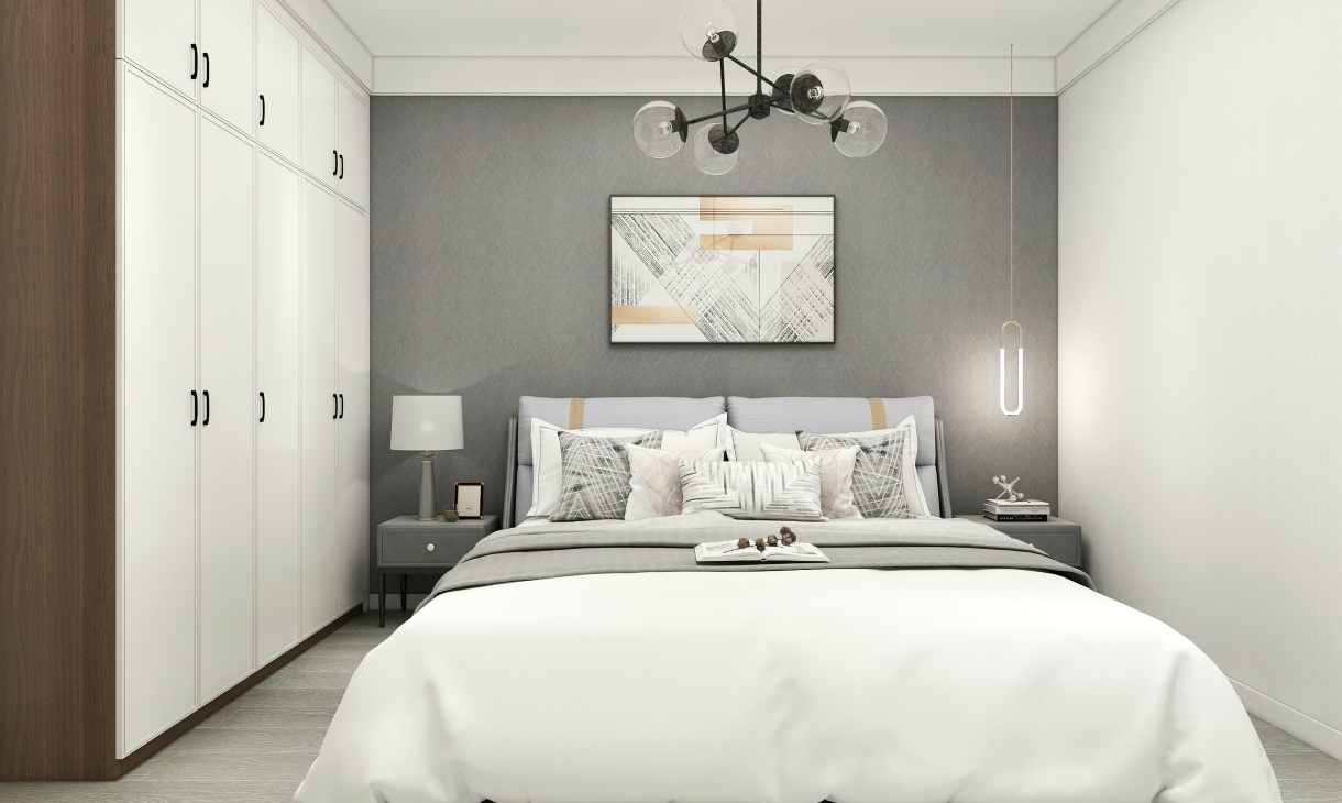 臥室的背景墻刷上=質(zhì)感十足的灰色,裝飾畫的選擇現(xiàn)代感十足,吊燈裝飾更顯時尚。