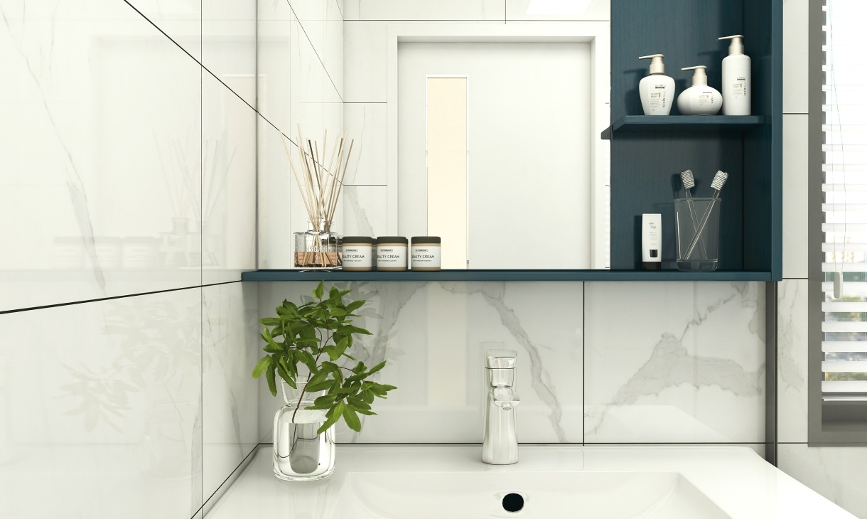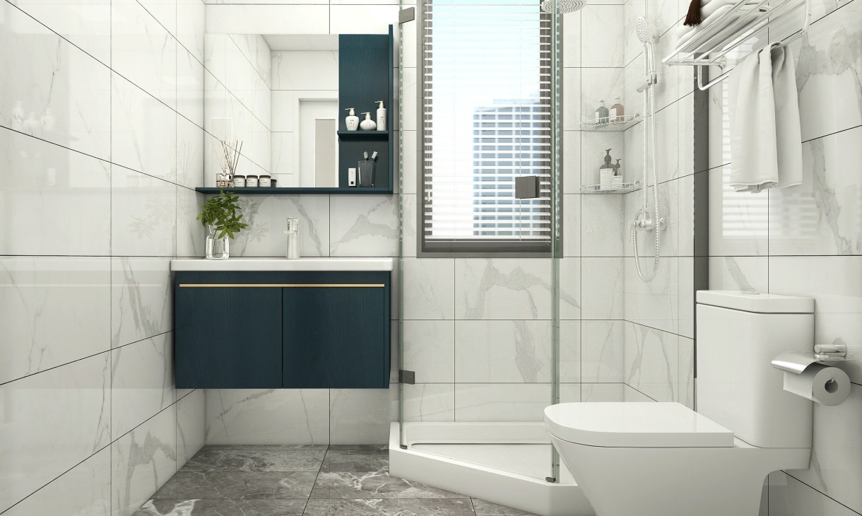 衛(wèi)生間設(shè)計成典型式干濕分離,轉(zhuǎn)角處設(shè)計洗漱臺,深藍色柜體搭配白色臺面時尚簡潔,洗浴空間實現(xiàn)干濕分離。