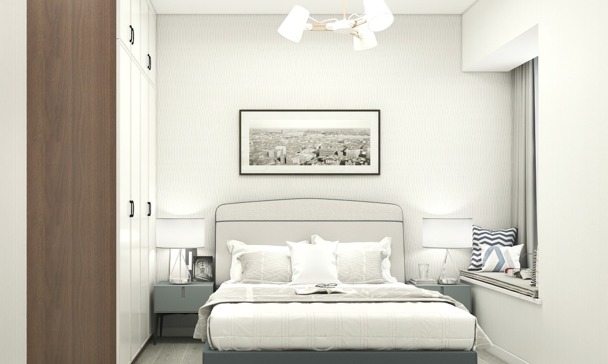 次臥按照戶型將小陽臺設(shè)計成休閑式飄窗,米白色的墻面搭配現(xiàn)代風(fēng)格臥室軟裝,大氣經(jīng)典,到頂衣柜滿足空間收納需求。
