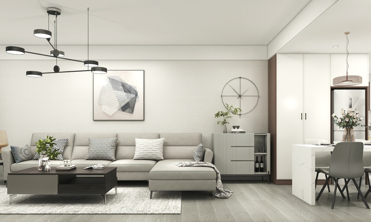 客餐廳以米色為主,木地板和墻面顏色一致,L型沙發(fā)布局實用大氣,顏色不一的抱枕豐富空間,綠植點綴更顯溫馨。