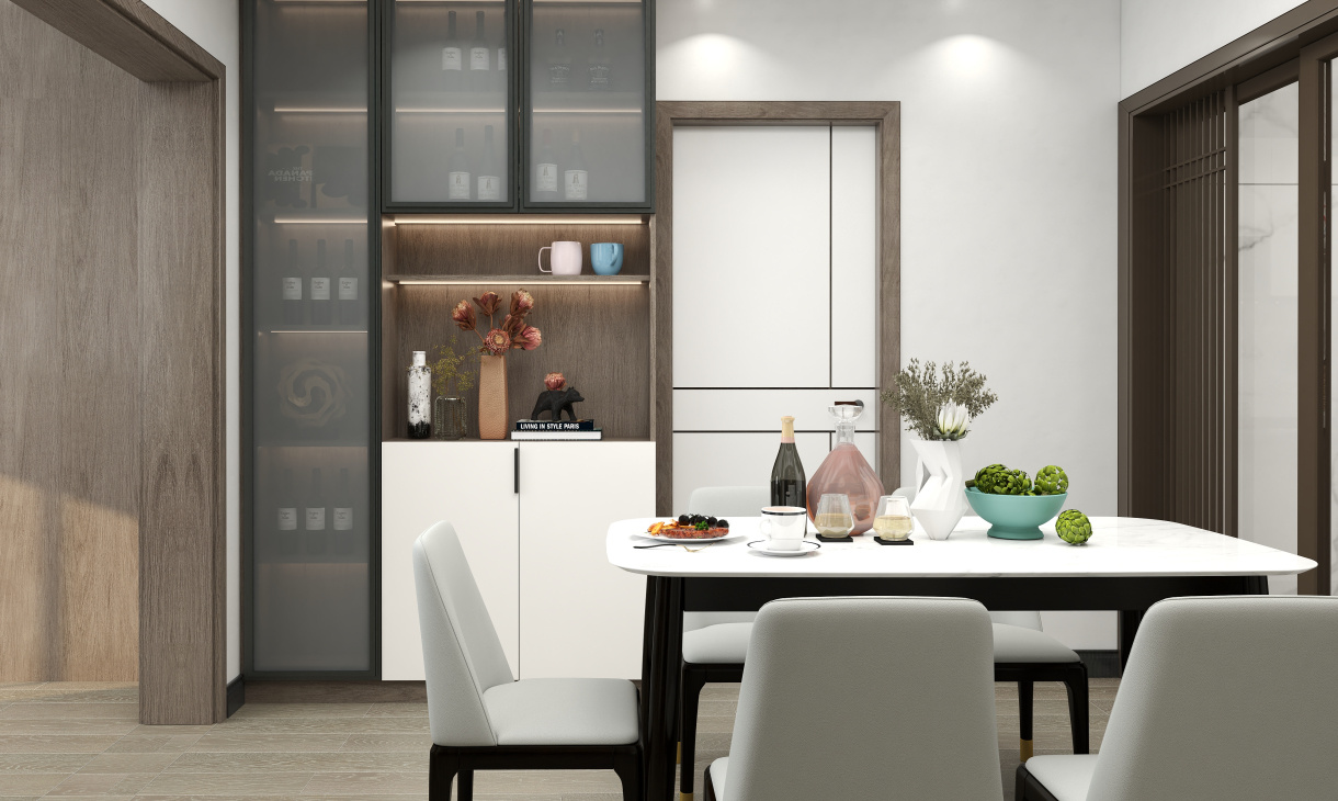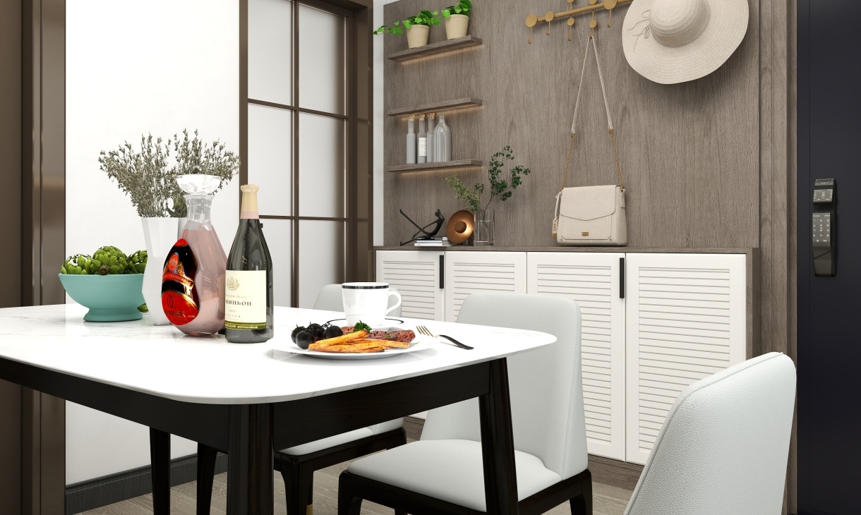 餐廳區(qū)域布局簡(jiǎn)潔大氣,經(jīng)典黑白搭配美感十足,黑白餐桌椅結(jié)合燈光裝飾收納柜既實(shí)用又美觀。