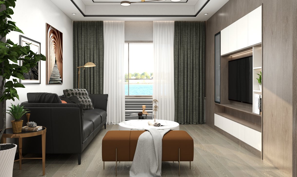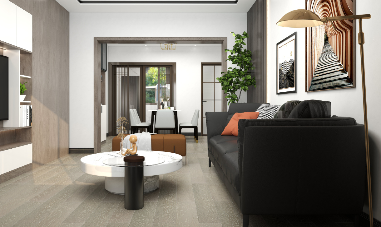客餐廳的整體空間以原木色為主,灰色的皮質(zhì)沙發(fā)搭配白色+原木色電視柜格調(diào)十足,地面鋪設(shè)木地板舒適加倍。