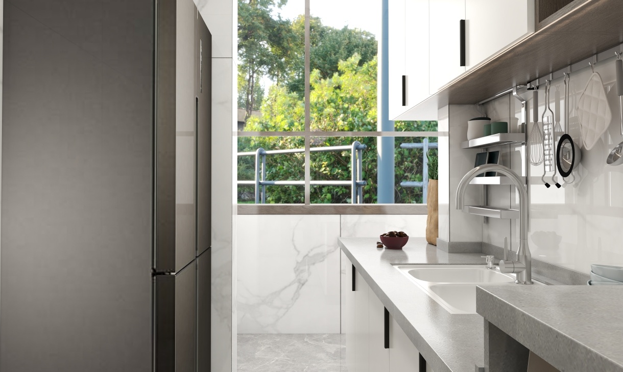 廚房空間不大,上下櫥柜的設(shè)計(jì)儲(chǔ)物空間和操作臺(tái)面都能滿(mǎn)足小戶(hù)型的收納、實(shí)用需求,動(dòng)線(xiàn)的合理,整潔大氣。