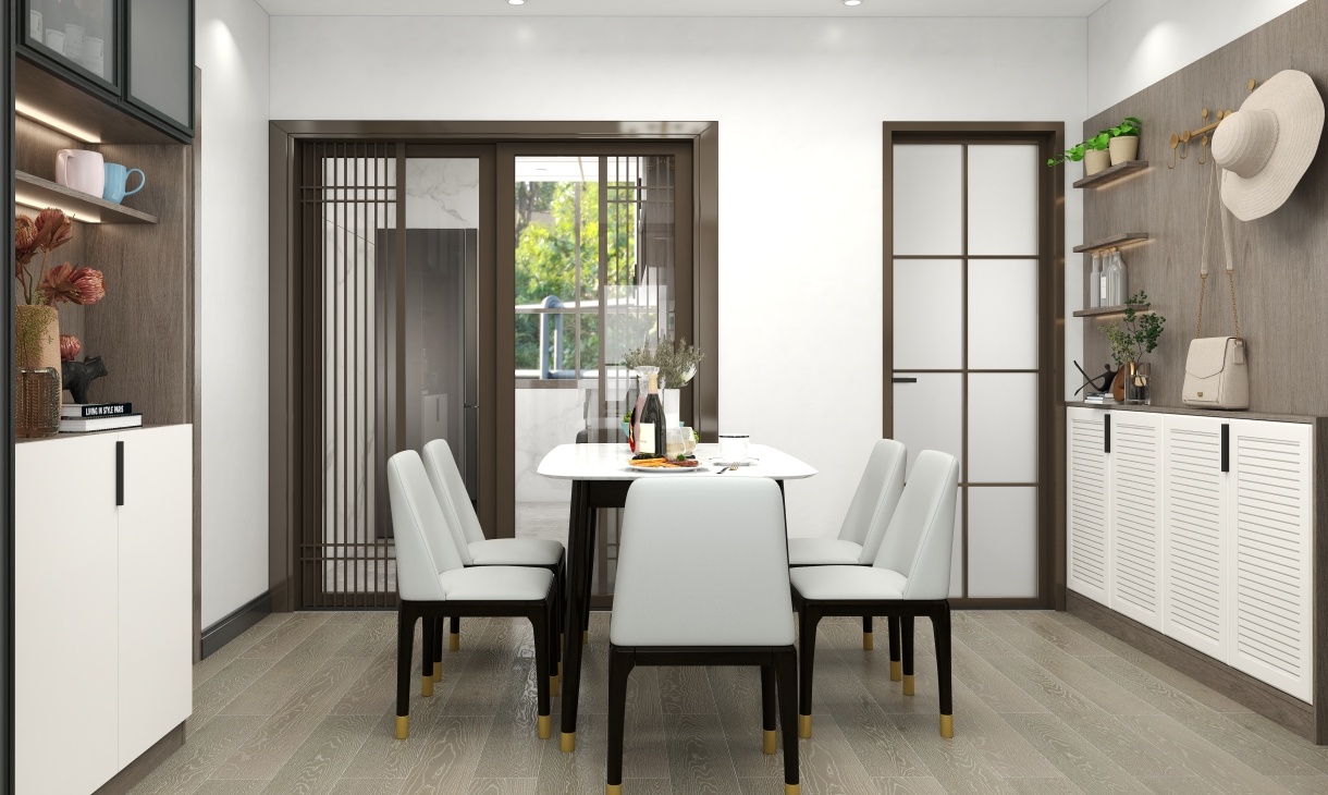 餐邊柜和客廳設(shè)計(jì)一致,白色+原木色搭配玻璃柜門(mén)增加通透性,米白色的餐桌和餐椅,使整個(gè)餐廳的空間顯得時(shí)尚大氣。