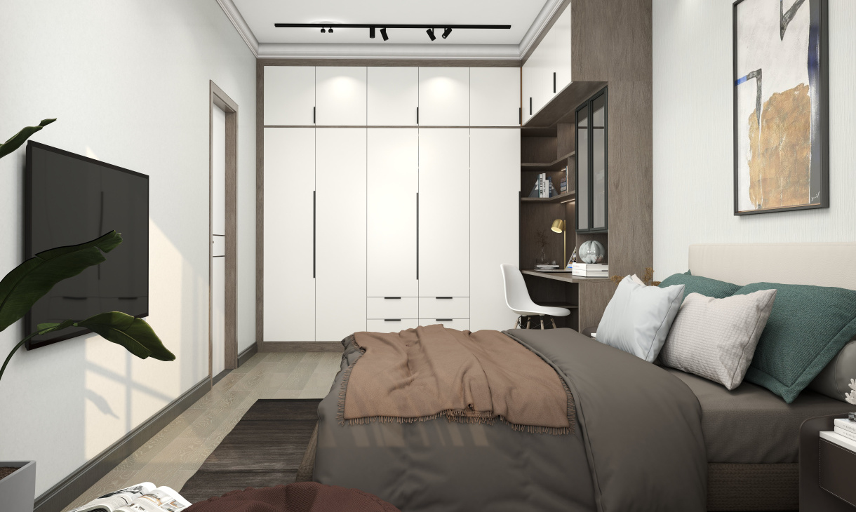 臥室沒(méi)有設(shè)計(jì)主燈,主要以筒燈作為光源,米白色的墻面與到頂衣柜彰顯整體性,原木色的書(shū)桌與床的顏色相呼應(yīng)。