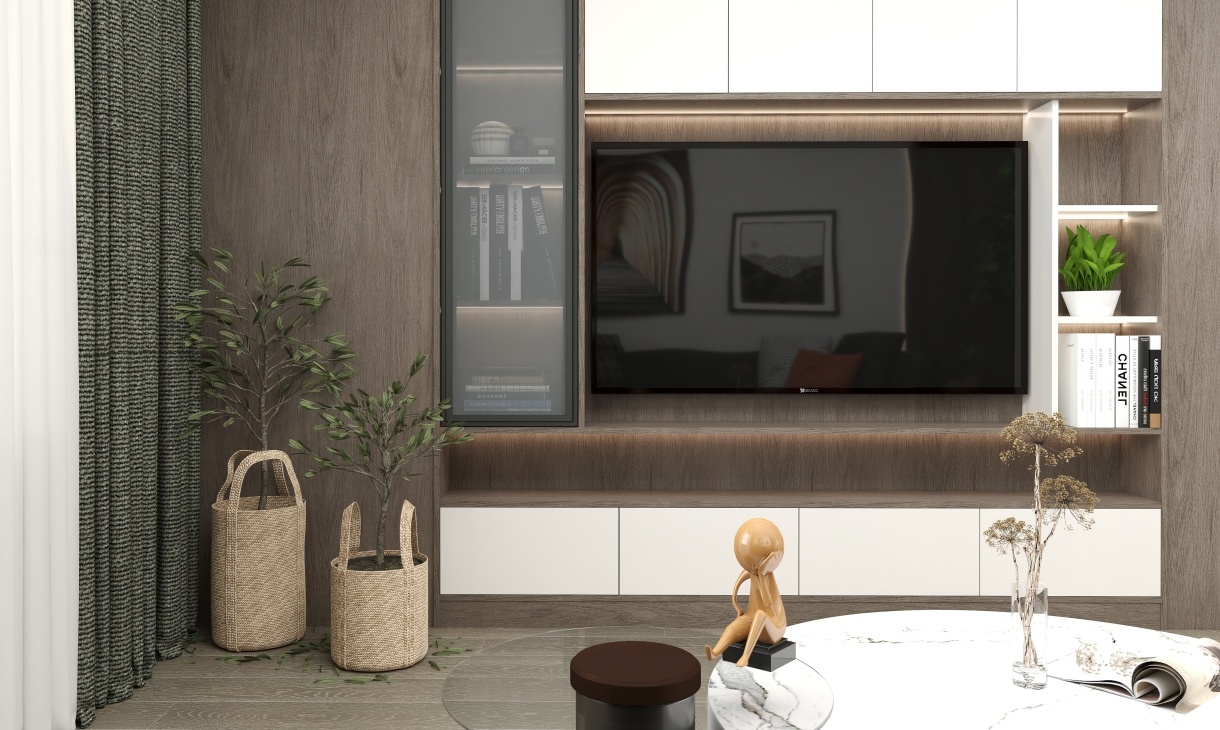 回字型電視柜滿(mǎn)足客廳的收納需求,白色柜門(mén)、原木色柜體的組合時(shí)尚大氣,靠近窗戶(hù)處設(shè)計(jì)玻璃收納柜彰顯通透。