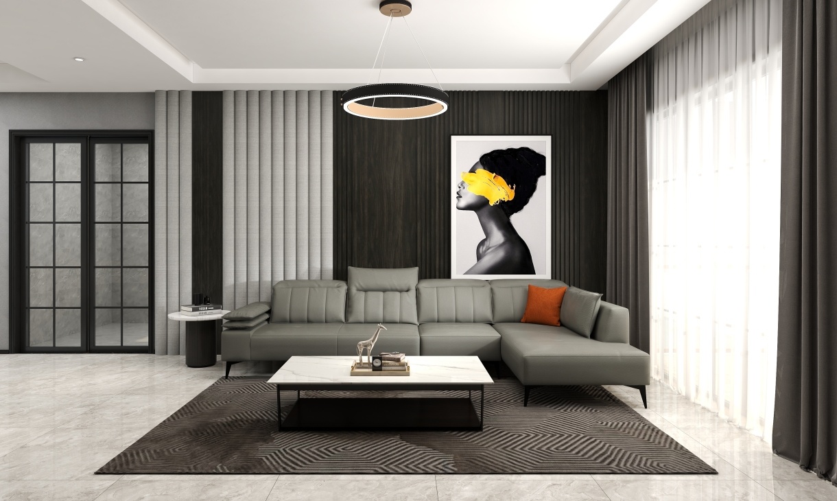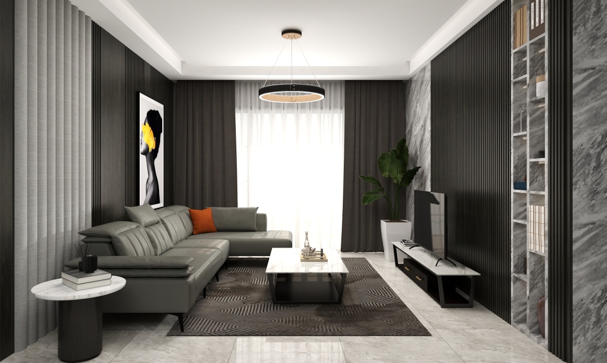電視背景墻是做了木飾面板的硬包造型,側邊設計大理石收納柜實用又美觀,整個客廳大部分以灰色調為主,營造出舒適又充滿質感的現代空間。