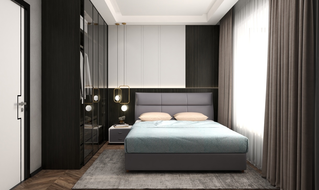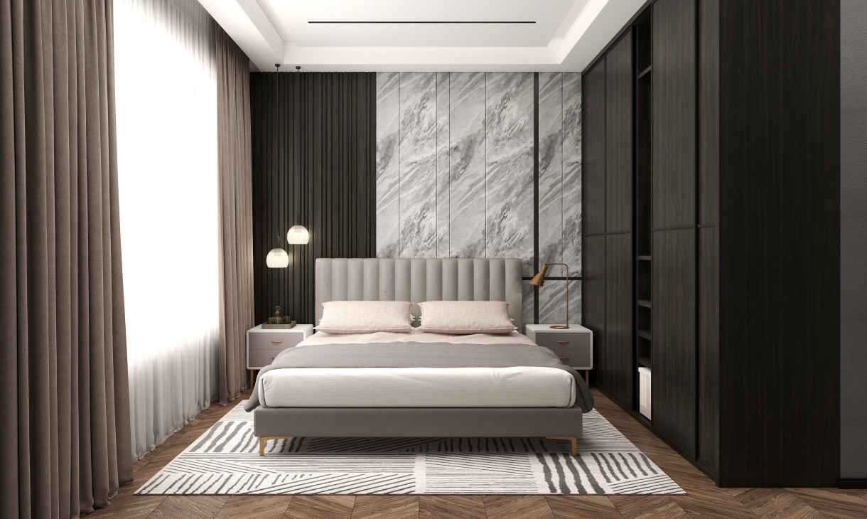 主臥的床頭背景墻設計和客廳沙發背景墻的表現手法一致,木飾面板拼接大理石,時尚大氣,到頂衣柜彰顯格調。
