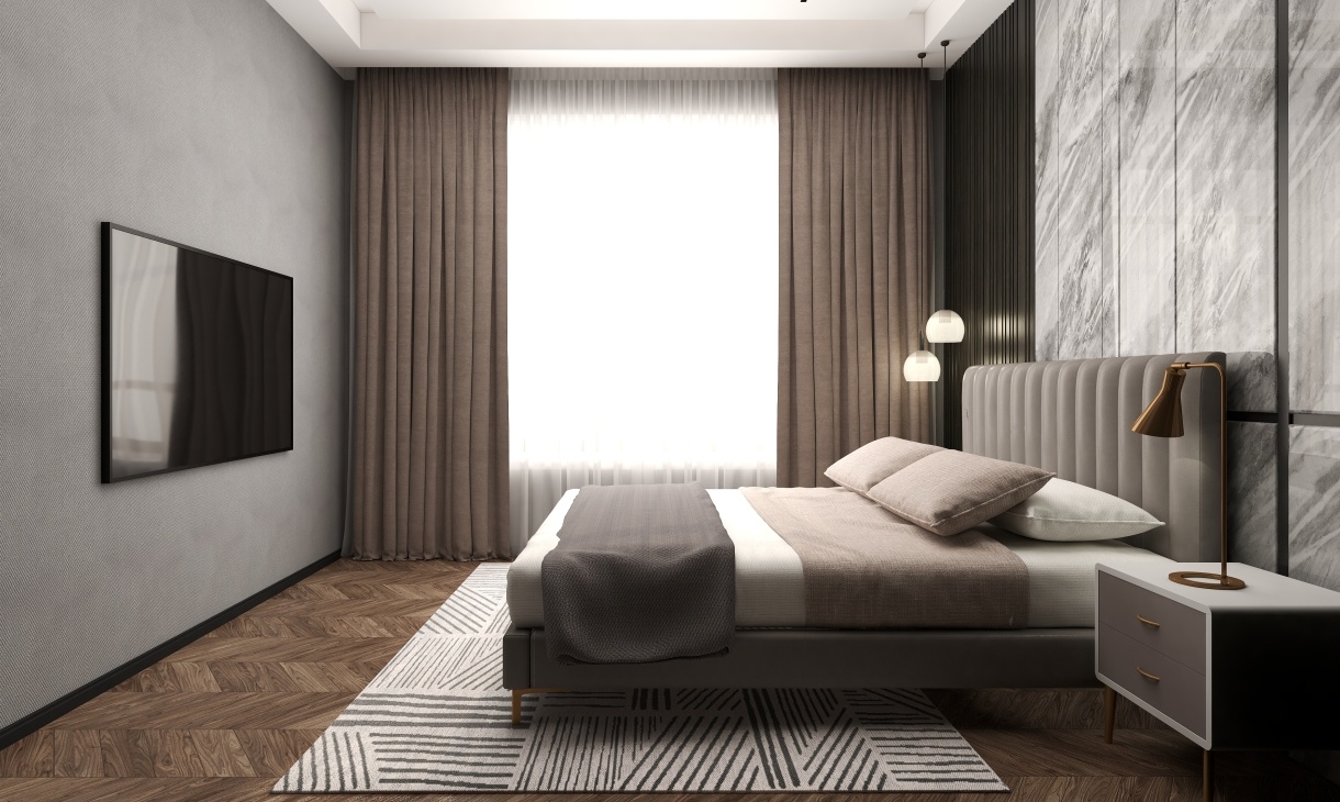 落地大窗使得臥室空間明亮大氣,也是品位的象征,木地板搭配駝色的軟裝更有品位。