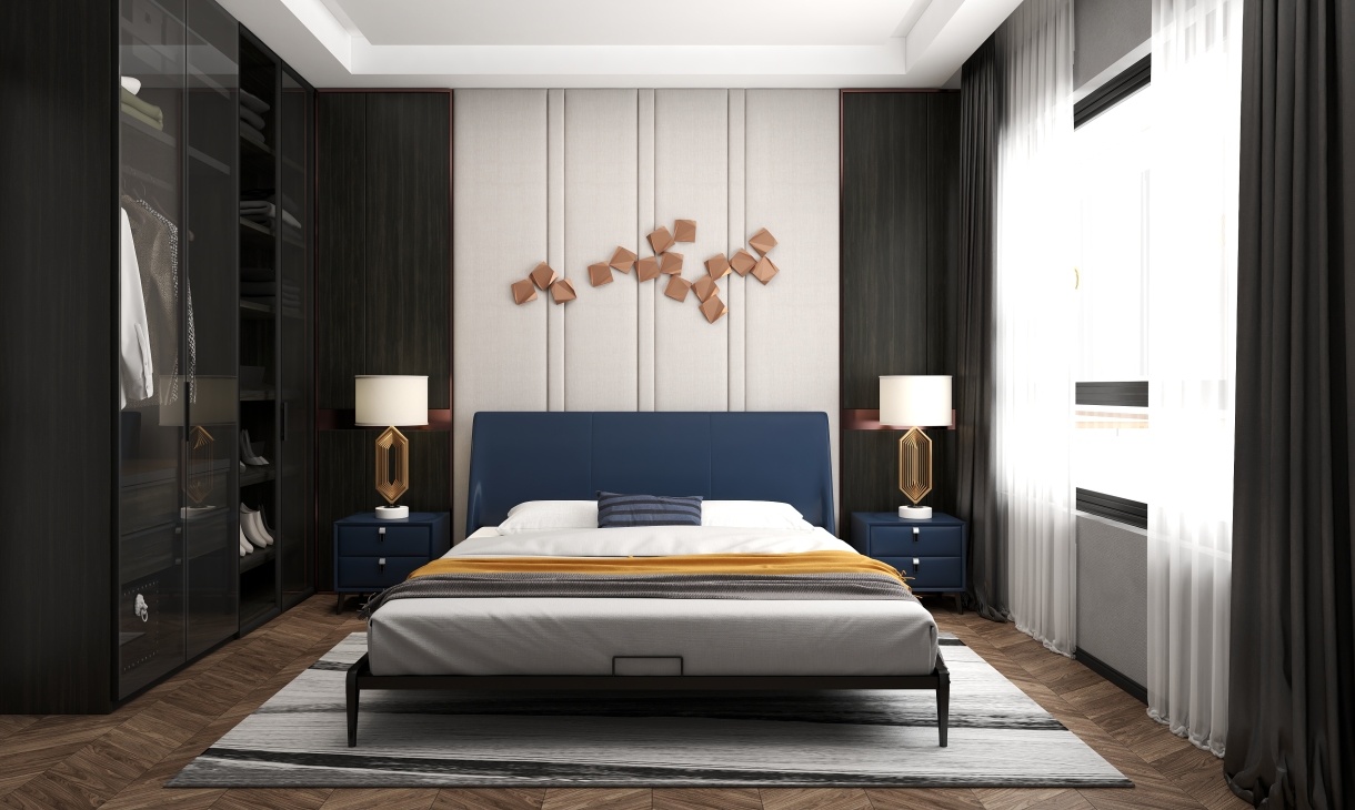 次臥顏色對比鮮明,藏藍色的床頭搭配米白色的背景墻舒適有品位,灰色的窗簾搭配白紗實用又美觀。