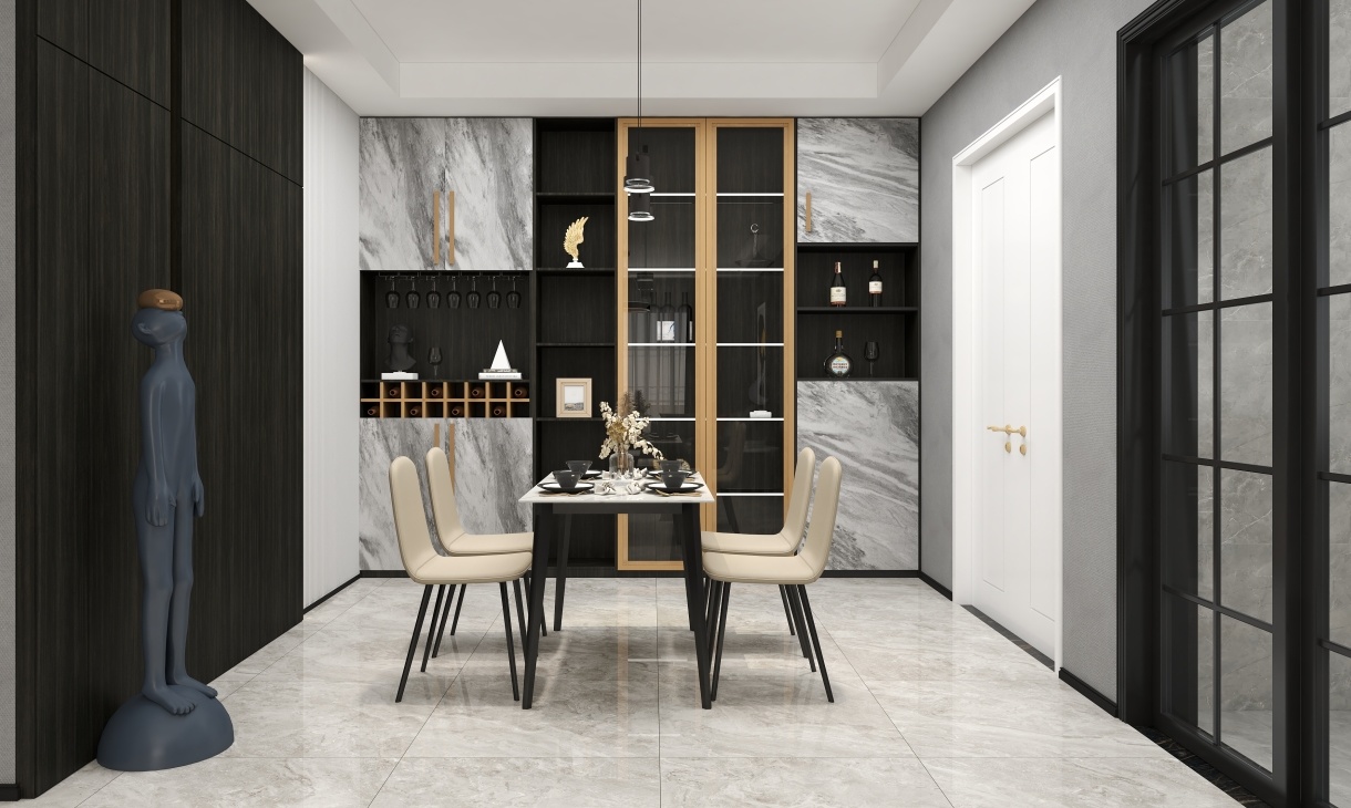 餐廳選用了款式簡潔的大理石長方形餐桌,精致的擺設增添空間格調,米黃色的皮質餐椅讓餐廳看起來更有品位。