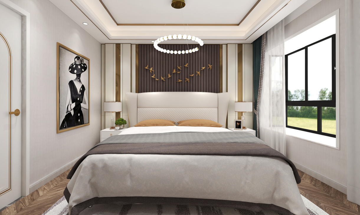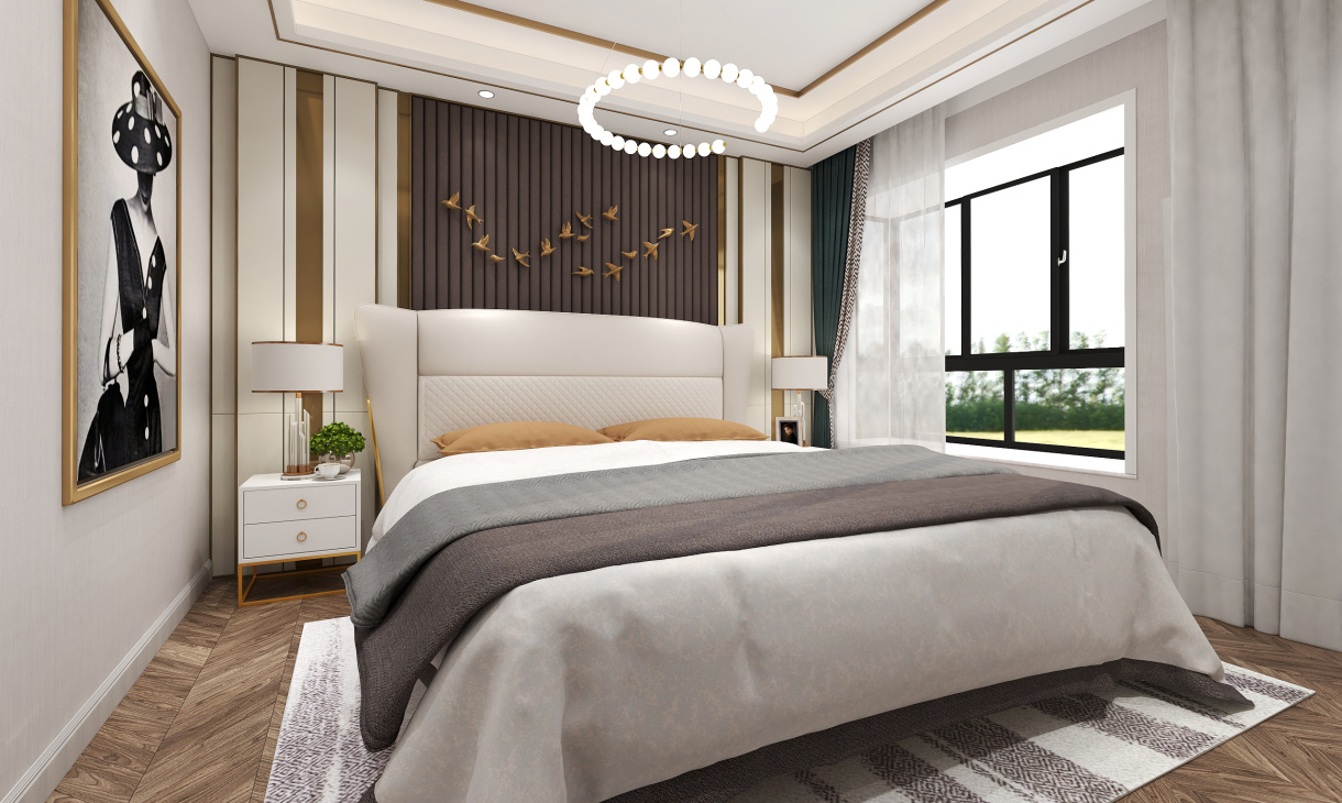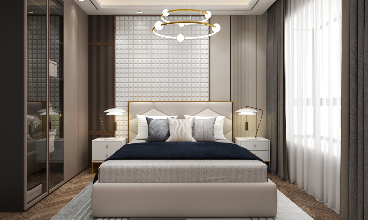次臥的背景墻上的紋理體現了一種莊重質感,白紗+灰色窗簾更有品位,地面鋪設木地板舒適加倍。