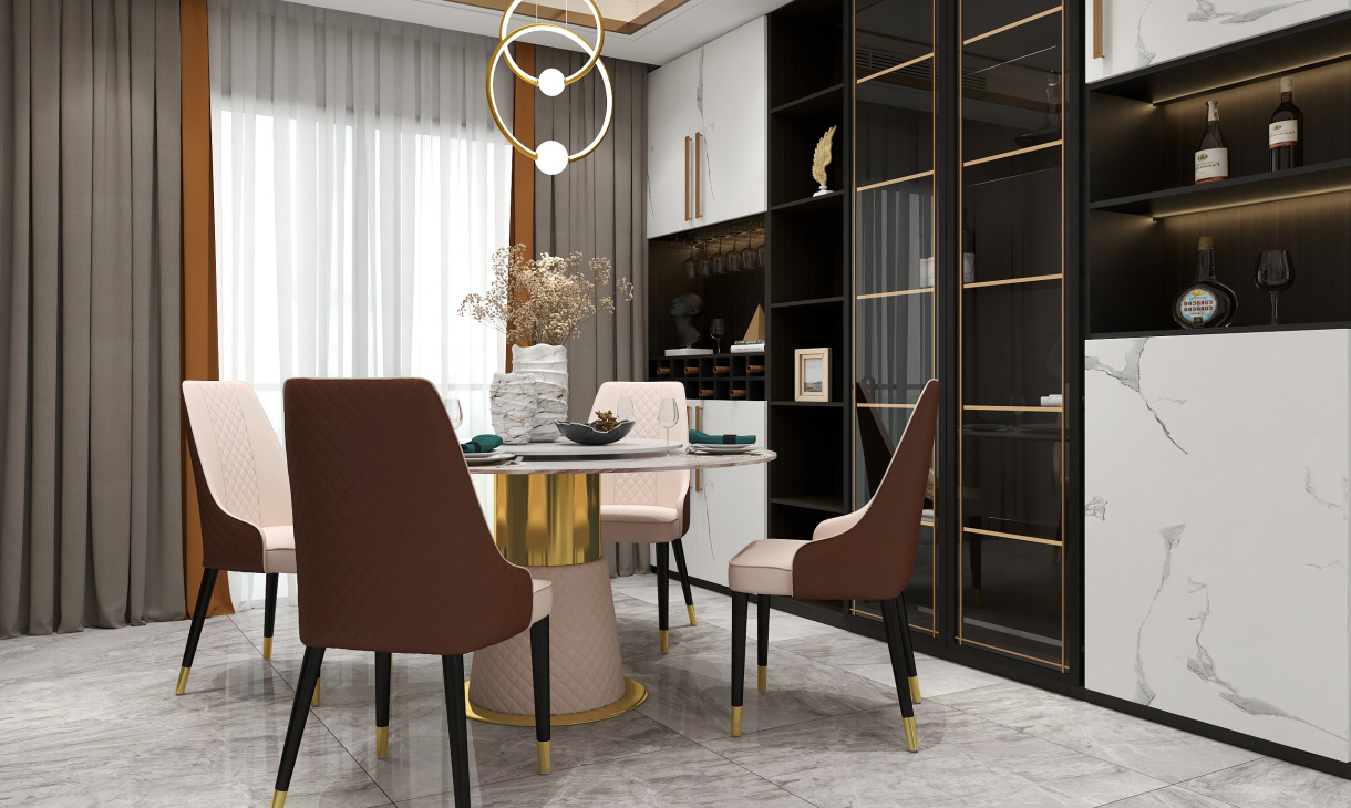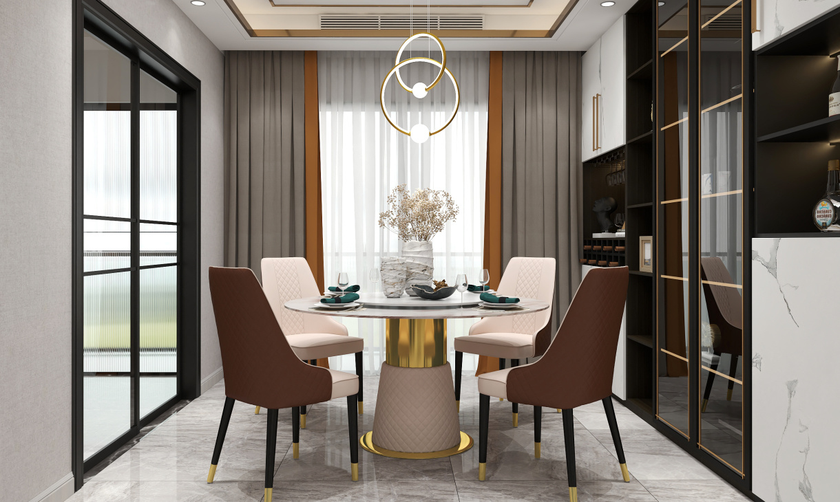 餐廳的整體設計典雅大氣,餐桌和餐椅是黃銅和大理石的完美融合,裝飾燈和餐桌上擺放的花瓶豐富空間。